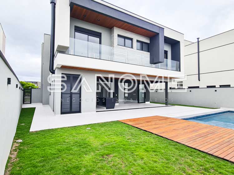 Piso superior: Sala íntima com varanda + 4 suítes (master com closet e banheira).