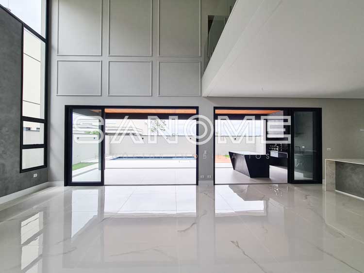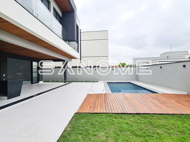 Piso térreo: Salas integradas, Escritório, Lavabo, Cozinha integrada, Área de serviço com despensa, Área gourmet, Banheiro de lazer externo, Depósitos e Piscina.