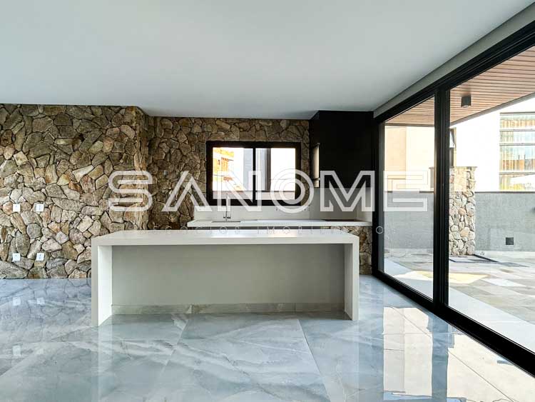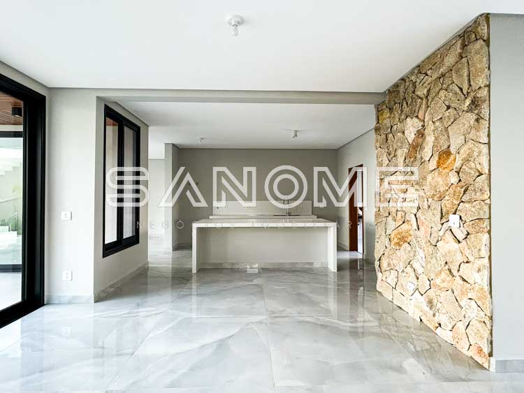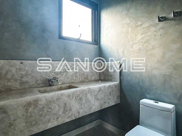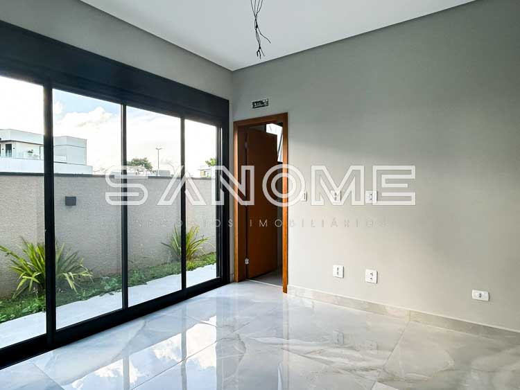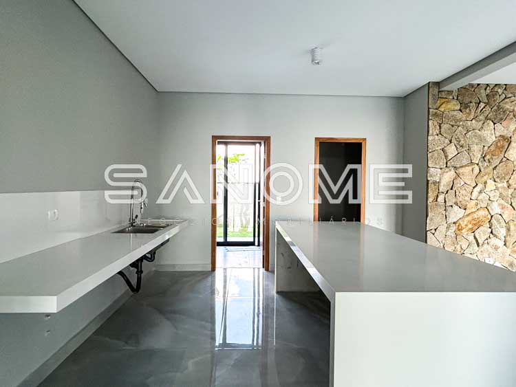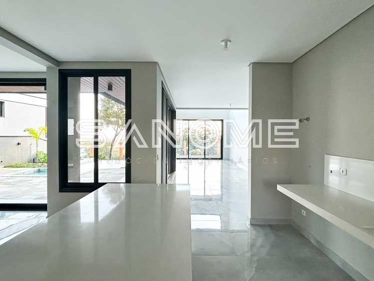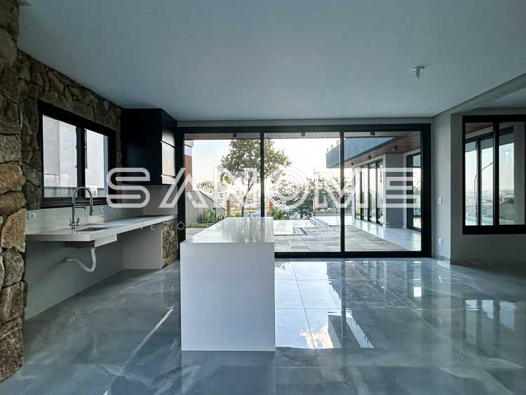 Bancadas e escadas em quartzo branco, Porcelanatos Vilagress, Aquecimento solar, Infraestrutura para elevador e Infraestrutura para energia fotovoltaica. Casa com localização privilegiada no condomínio sem vizinhos de frente e vista livre para área verde.
