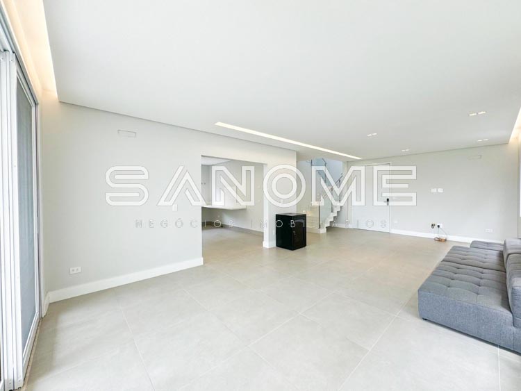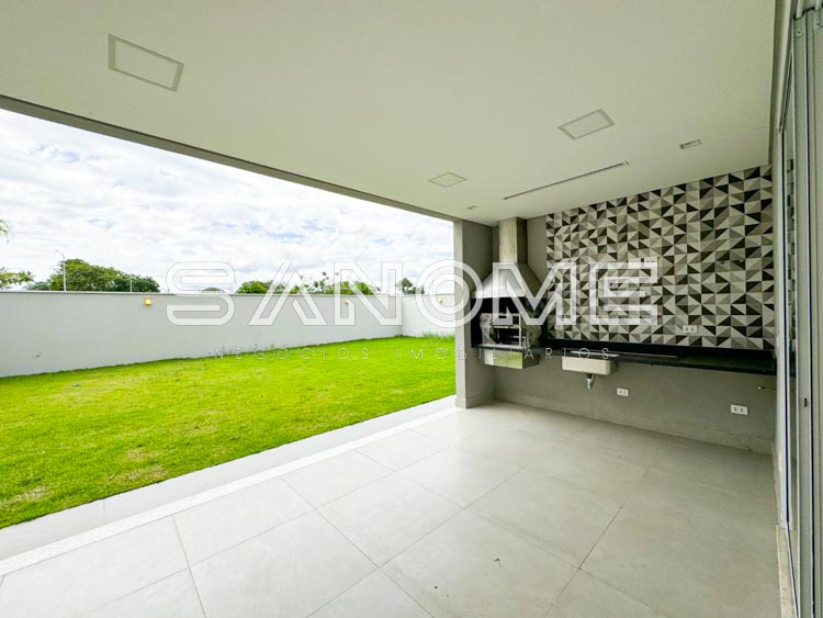 Piso térreo: Salas integradas, Lavabo, Cozinha integrada, Despensa, Área de serviço, Área gourmet, Banheiro de lazer externo, Hobby box e Amplo quintal gramado.