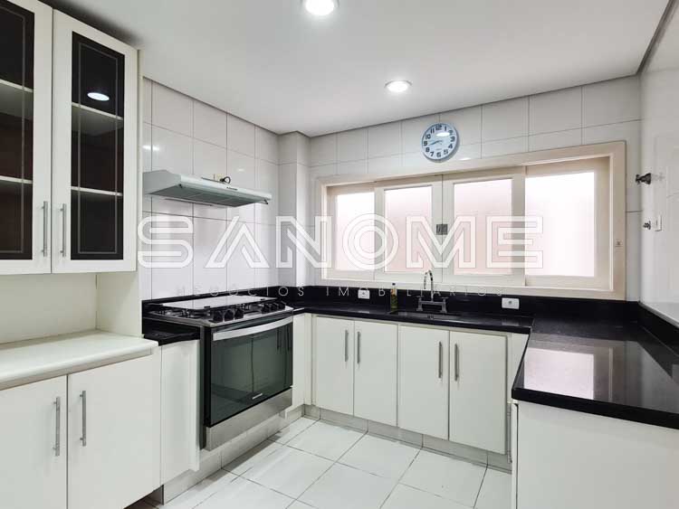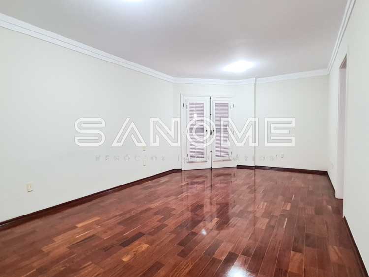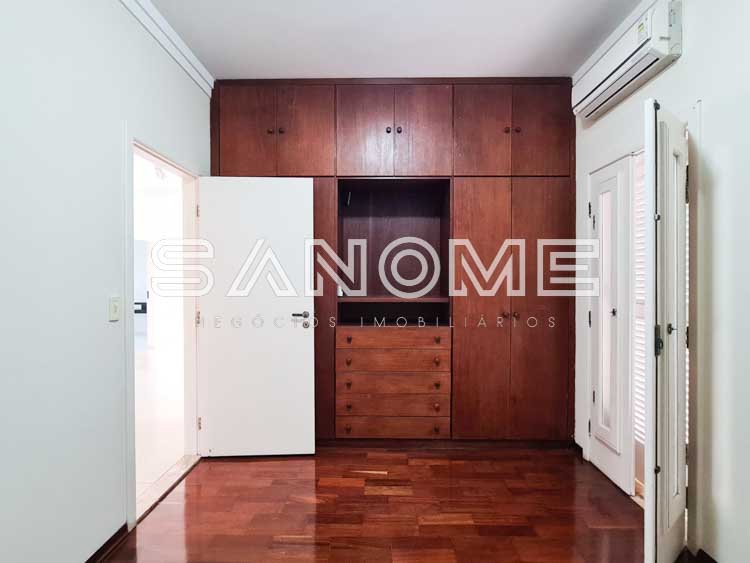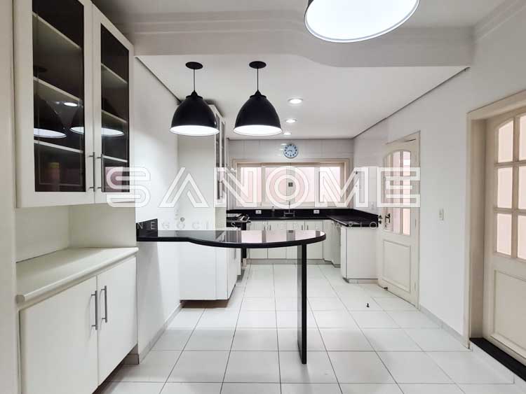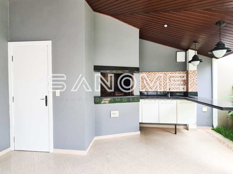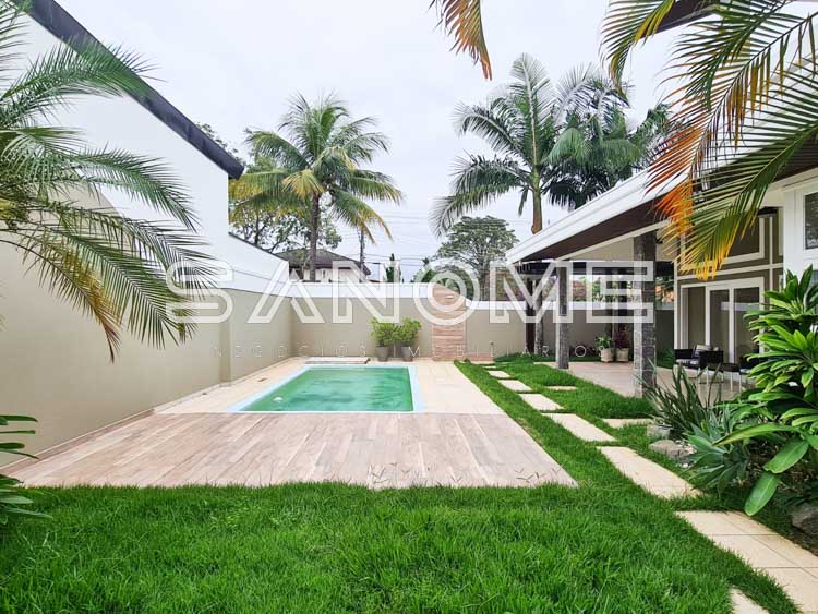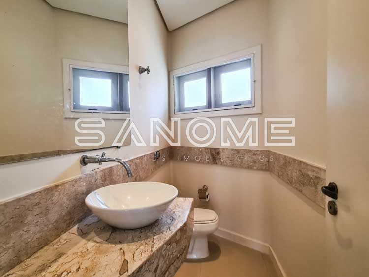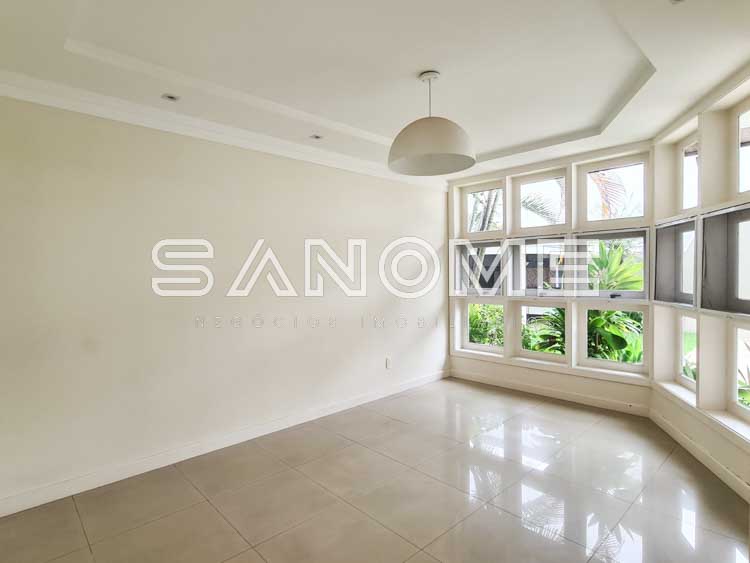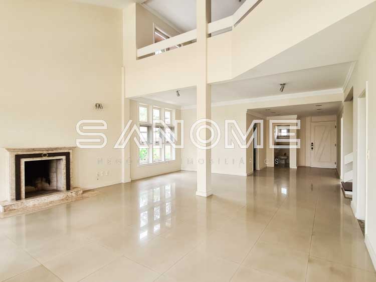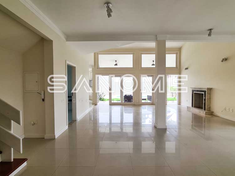 Piso térreo: Hall de entrada com lavabo, Escritório/Suíte com armários, Sala 2 ambientes com lareira e pé direito duplo, Sala de almoço, Cozinha planejada com copa, Área de serviço, Quarto e banheiro de empregados, Área de churrasqueira com depósito, Banheiro de lazer externo, Varanda externa e Piscina.