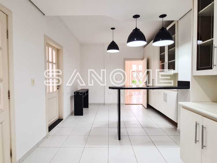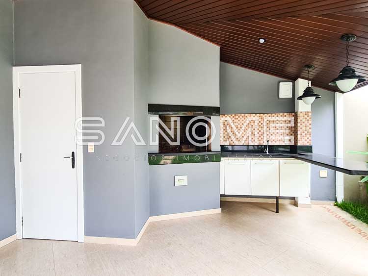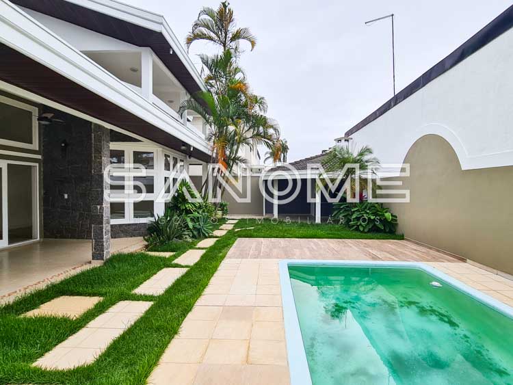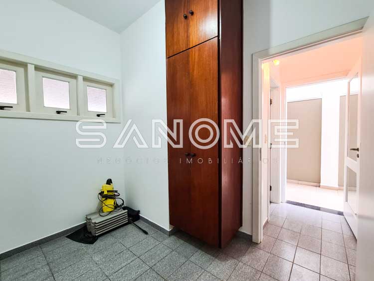 Piso térreo: Hall de entrada com lavabo, Escritório/Suíte com armários, Sala 2 ambientes com lareira e pé direito duplo, Sala de almoço, Cozinha planejada com copa, Área de serviço, Quarto e banheiro de empregados, Área de churrasqueira com depósito, Banheiro de lazer externo, Varanda externa e Piscina.