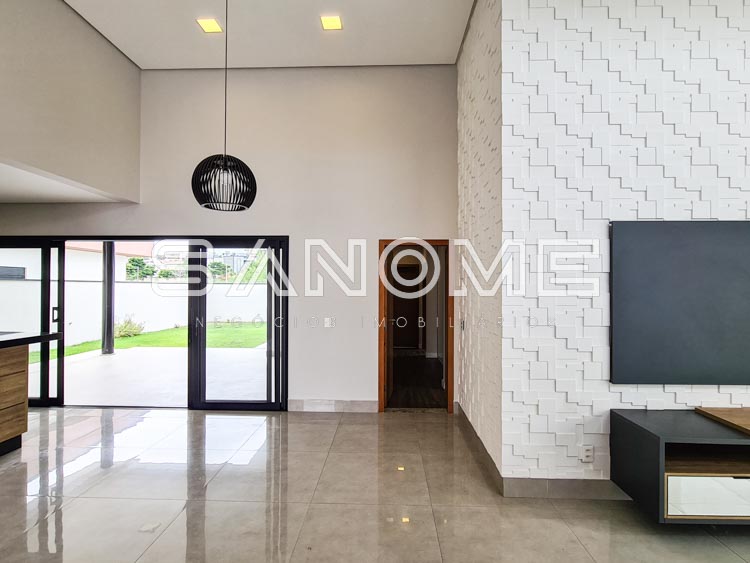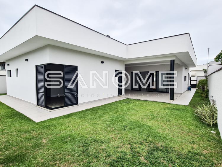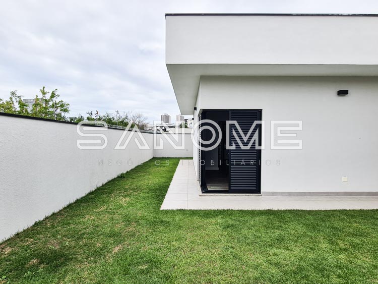 Térrea, 3 suítes (master com closet), Sala 2 ambientes, Lavabo, Escritório, Cozinha integrada (com armários), Despensa, Área de serviço, Quarto de depósito, Área gourmet, Banheiro de lazer externo e Quintal gramado.