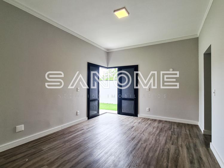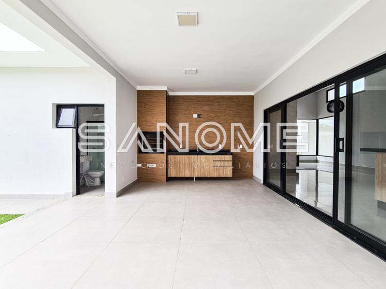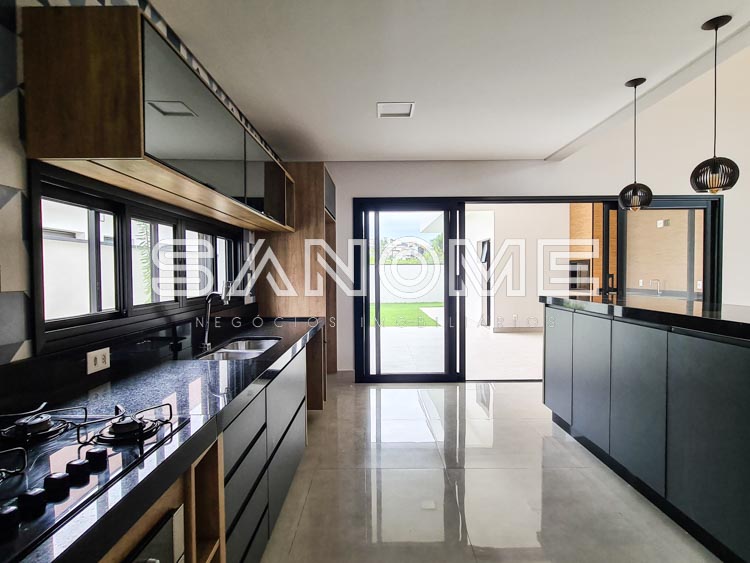Térrea, 3 suítes (master com closet), Sala 2 ambientes, Lavabo, Escritório, Cozinha integrada (com armários), Despensa, Área de serviço, Quarto de depósito, Área gourmet, Banheiro de lazer externo e Quintal gramado.