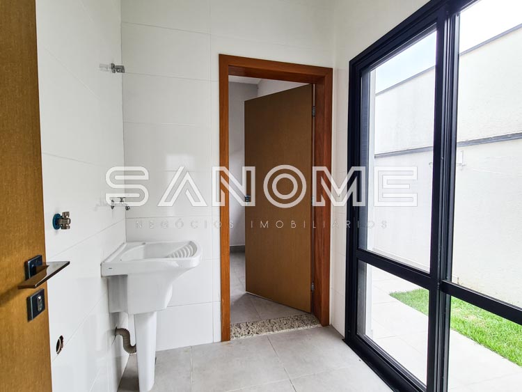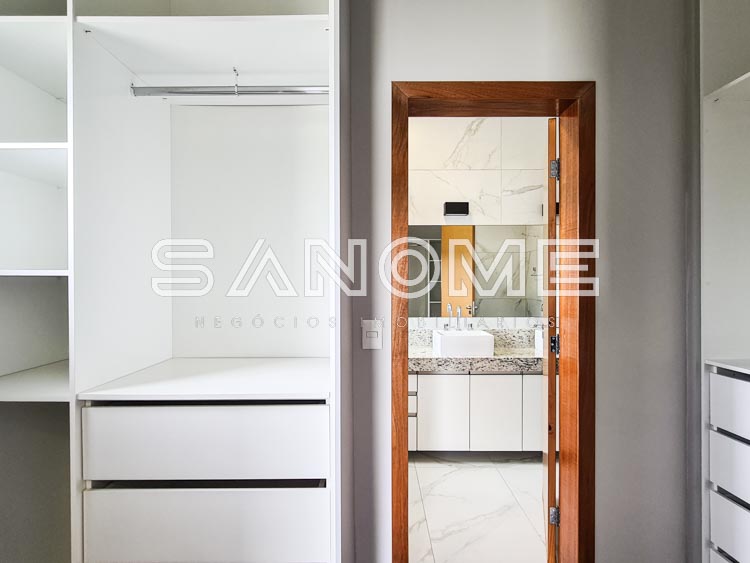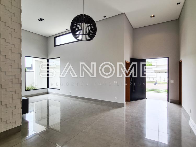 Térrea, 3 suítes (master com closet), Sala 2 ambientes, Lavabo, Escritório, Cozinha integrada (com armários), Despensa, Área de serviço, Quarto de depósito, Área gourmet, Banheiro de lazer externo e Quintal gramado.