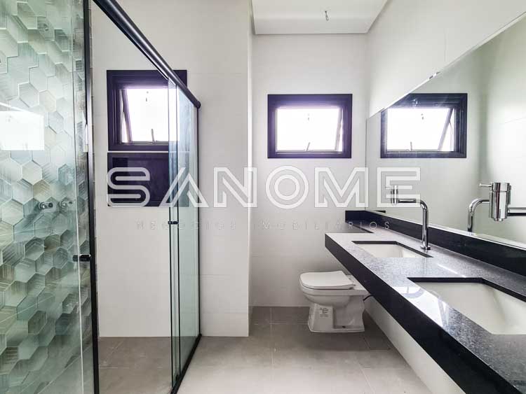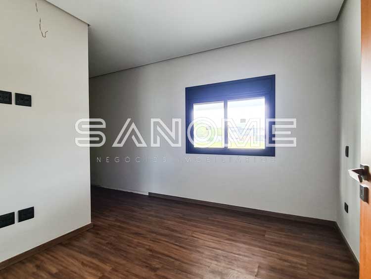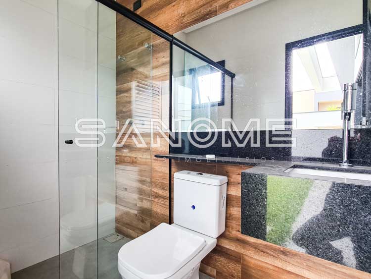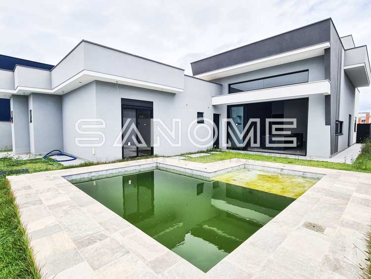 Térrea, 4 suítes (suíte máster com closet), Salas integradas com pé direito duplo, Lavabo, Escritório, Cozinha gourmet integrada com salas e quintal, Quarto de depósito, Área de serviço, Banheiro externo e Quintal com piscina.
