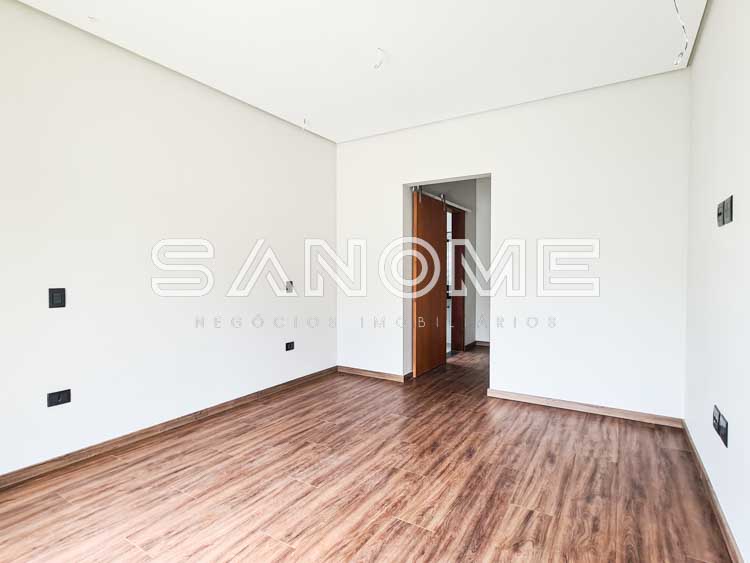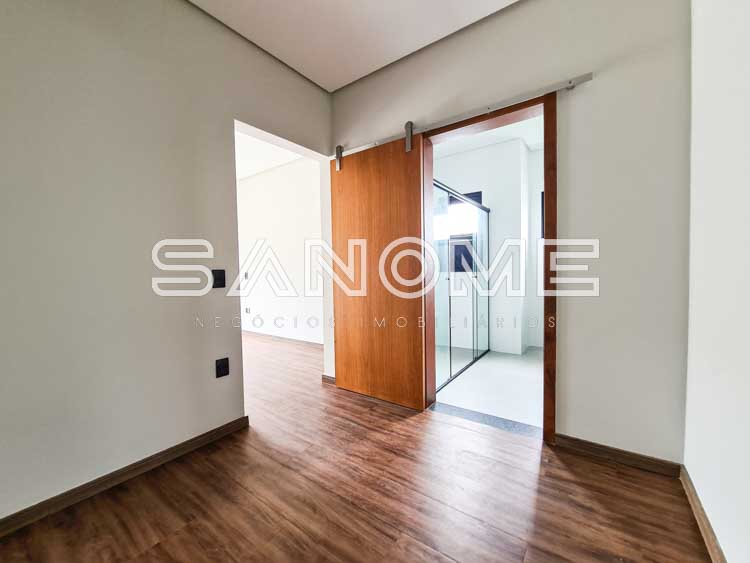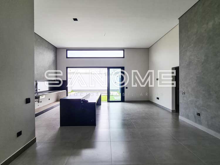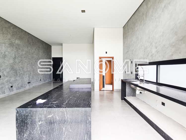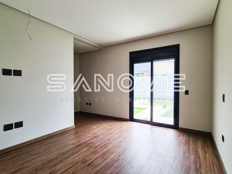 Térrea, 4 suítes (suíte máster com closet), Salas integradas com pé direito duplo, Lavabo, Escritório, Cozinha gourmet integrada com salas e quintal, Quarto de depósito, Área de serviço, Banheiro externo e Quintal com piscina.