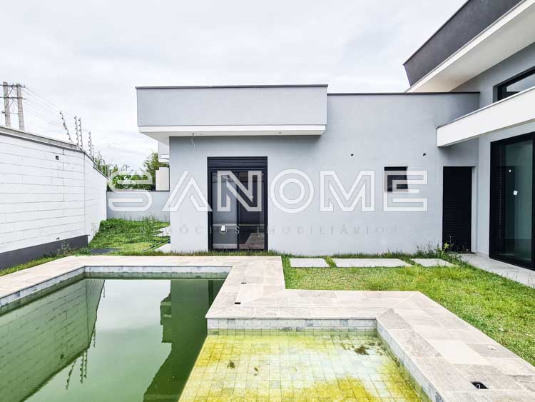 Térrea, 4 suítes (suíte máster com closet), Salas integradas com pé direito duplo, Lavabo, Escritório, Cozinha gourmet integrada com salas e quintal, Quarto de depósito, Área de serviço, Banheiro externo e Quintal com piscina.