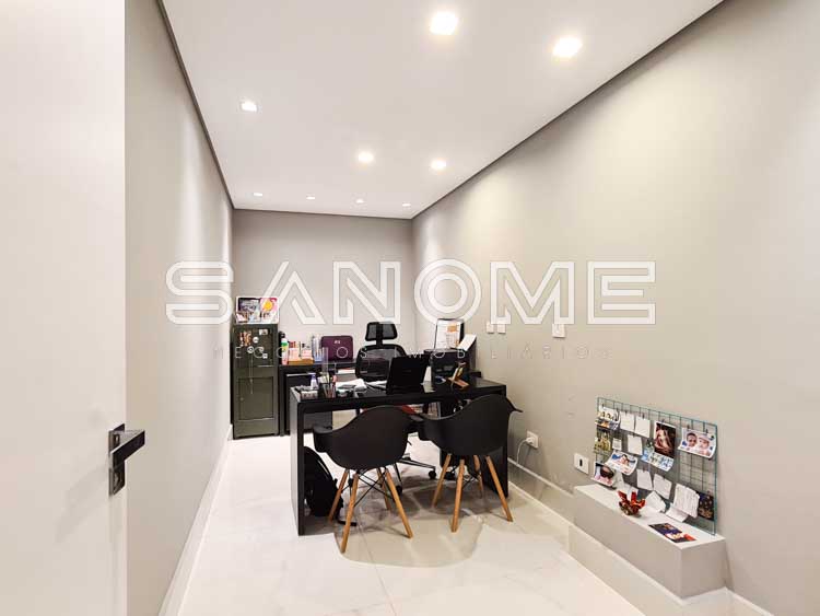 6 suítes (suíte máster com amplo closet e varanda com vista, 1 suíte no piso térreo e 2 suítes no piso inferior), Sala de jantar, Sala de TV, Lavabo, Sala de cinema no piso inferior e Escritório.