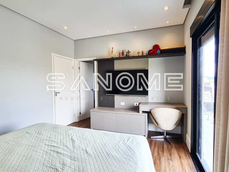 6 suítes (suíte máster com amplo closet e varanda com vista, 1 suíte no piso térreo e 2 suítes no piso inferior), Sala de jantar, Sala de TV, Lavabo, Sala de cinema no piso inferior e Escritório.
