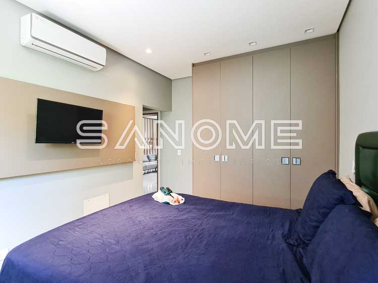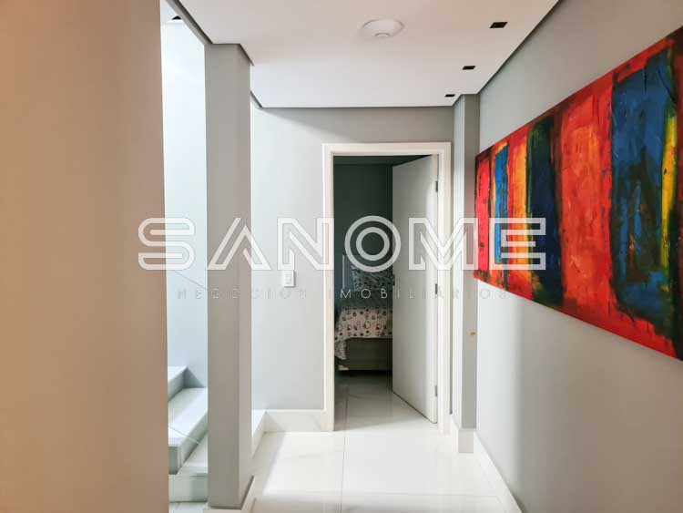 6 suítes (suíte máster com amplo closet e varanda com vista, 1 suíte no piso térreo e 2 suítes no piso inferior), Sala de jantar, Sala de TV, Lavabo, Sala de cinema no piso inferior e Escritório.