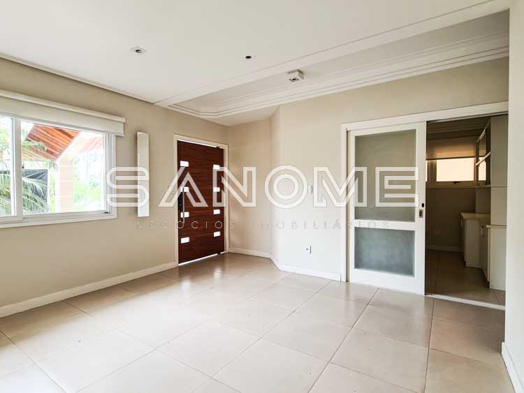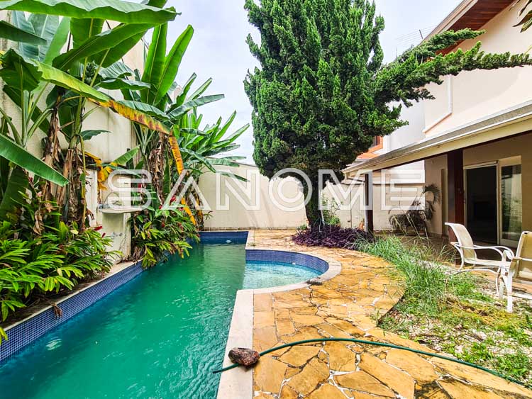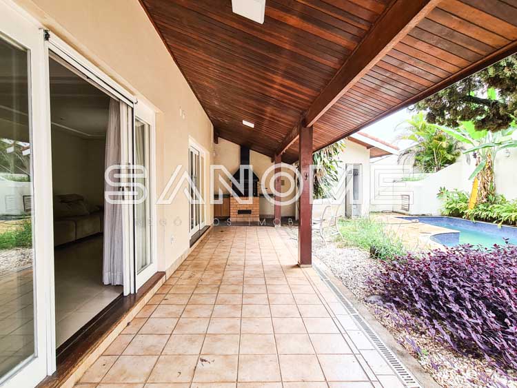 Piso térreo: Sala de estar, Lavabo, Escritório, Sala de jantar, Sala de lareira, Sala de TV, Cozinha planejada, Área de serviço, Varanda externa, Churrasqueira, Forno de pizza, Banheiro de lazer externo, Sauna e Piscina com cascata.