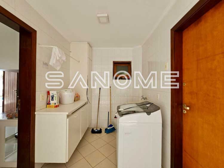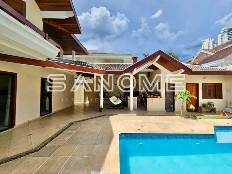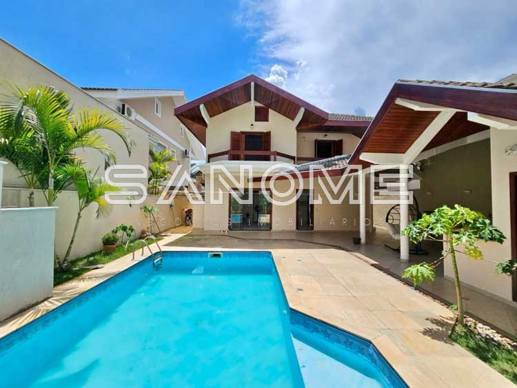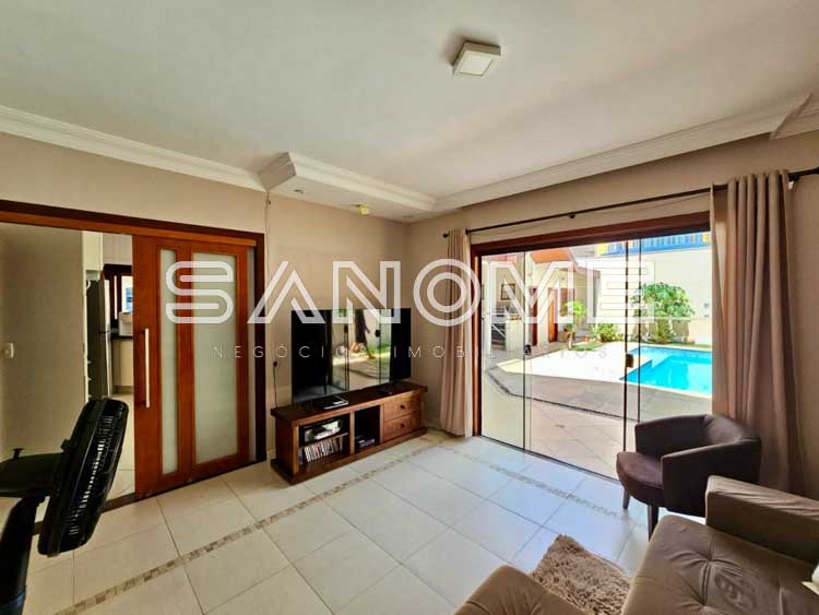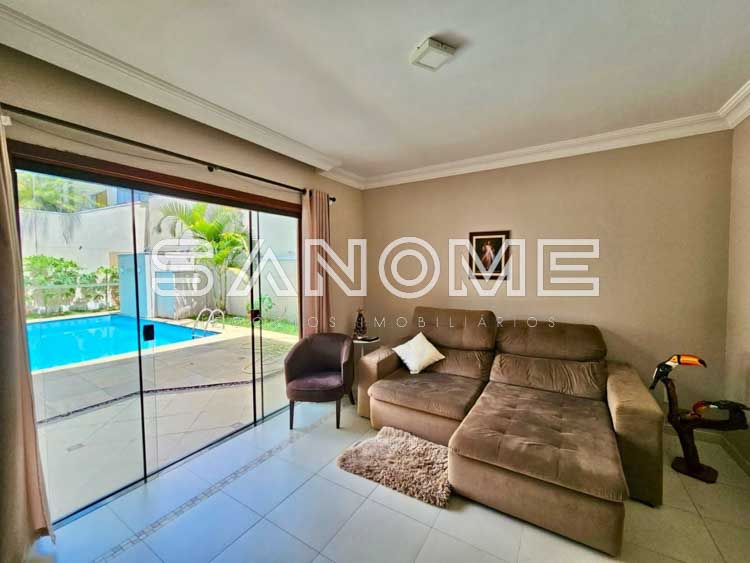 Piso térreo: Sala de estar, Sala de jantar, Lavabo, Sala de TV, Cozinha planejada, Despensa, Área de serviço, Quarto e banheiro de empregados, Área de churrasqueira, Banheiro de lazer externo e Piscina com cascata (aquecimento solar).