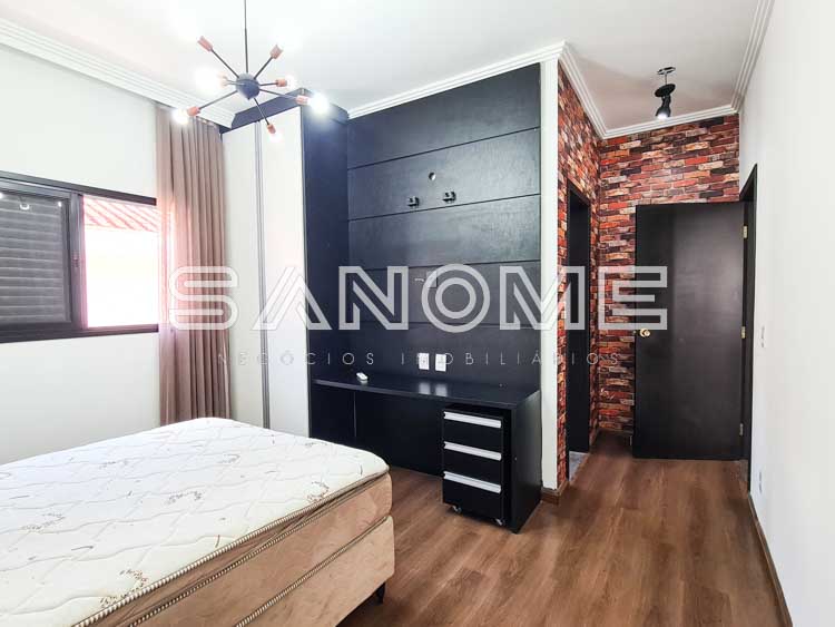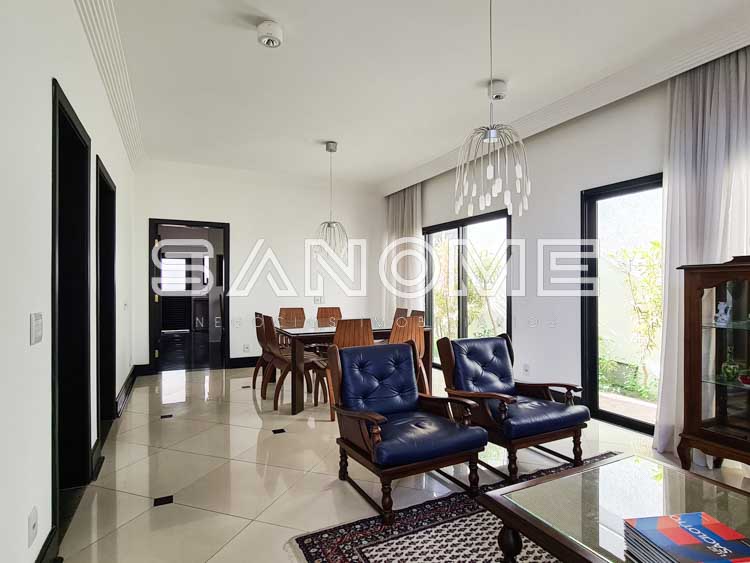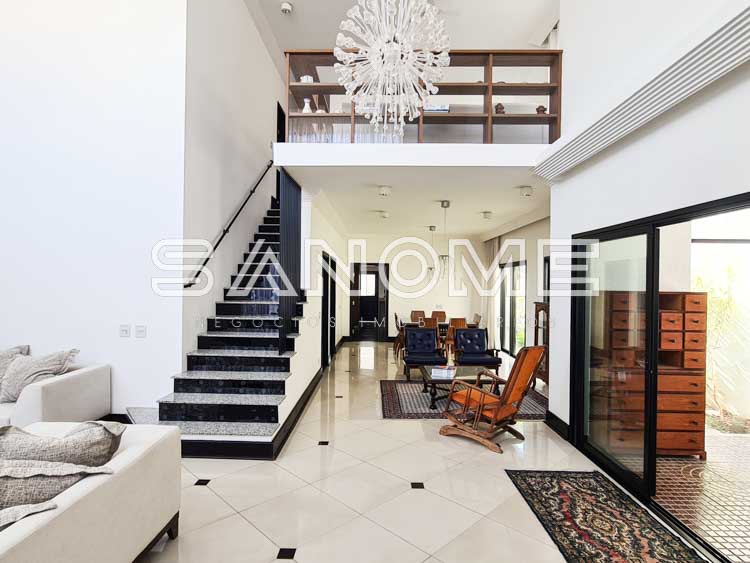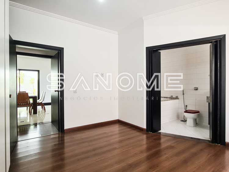 Piso térreo: 2 suítes (master com closet e 1 suíte com banheira), Sala de estar com pé direito duplo, Sala de jantar, Lavabo, Cozinha planejada, Copa, Despensa, Área de serviço com suíte de empregados/hóspedes, Área gourmet com churrasqueira e Banheiro de lazer externo.