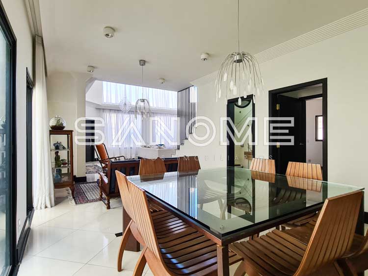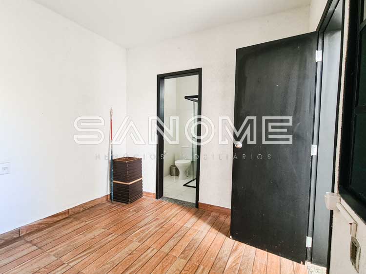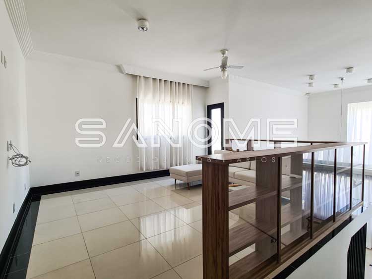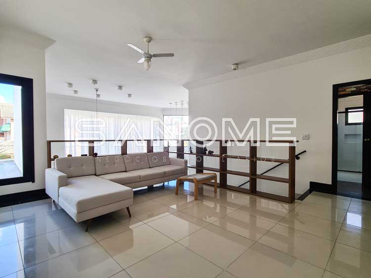 Piso superior: Sala íntima com varanda + 3 suítes.