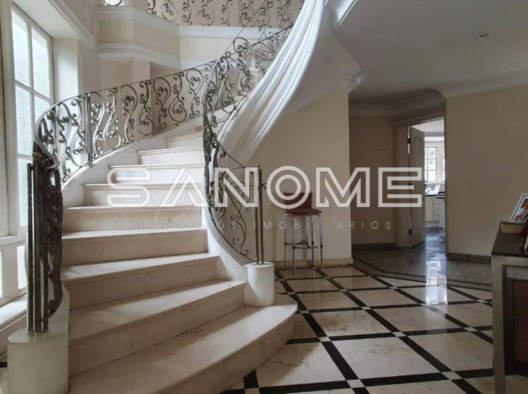 Piso térreo: Sala de estar com lareira, Sala de jantar, Lavabo, Sala de TV, Cozinha planejada, Área de serviço, Amplo quintal gramado, Área de churrasqueira, Quarto de depósito e Piscina.