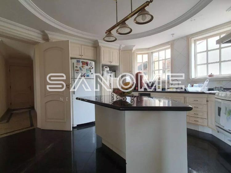 Piso térreo: Sala de estar com lareira, Sala de jantar, Lavabo, Sala de TV, Cozinha planejada, Área de serviço, Amplo quintal gramado, Área de churrasqueira, Quarto de depósito e Piscina.