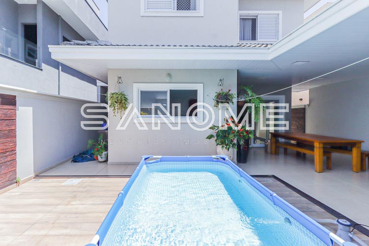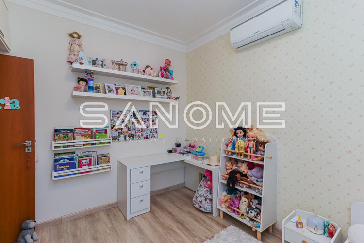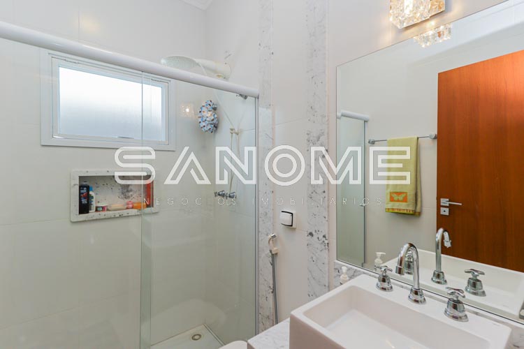 4 dormitórios (2 suítes – suíte máster com closet, sacada e banheira), Banheiro social, Sala 2 ambientes, Sala de TV, Lavabo, Cozinha com despensa, Área de serviço, Banheiro externo, Área gourmet e Quintal com ducha.