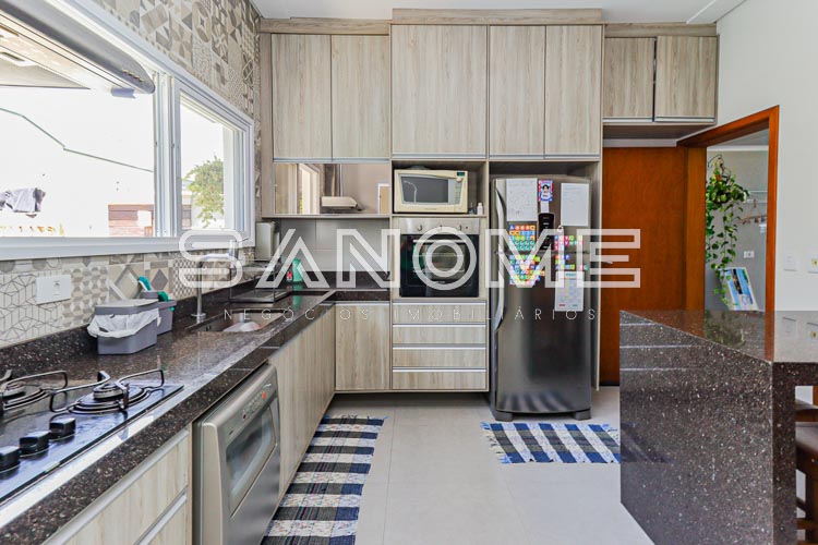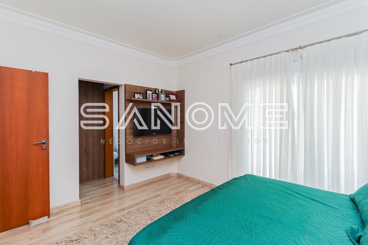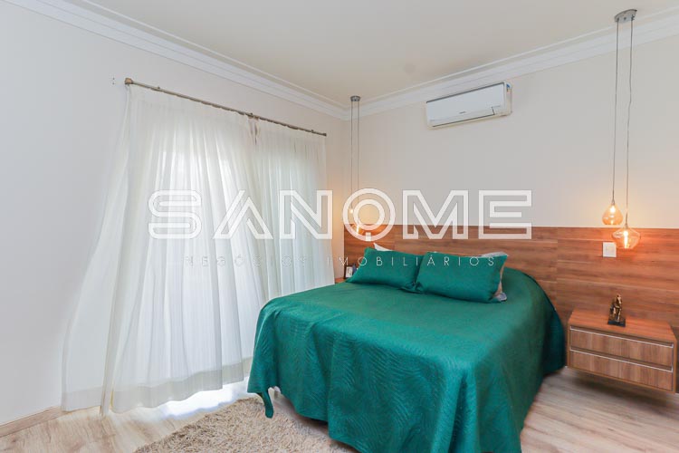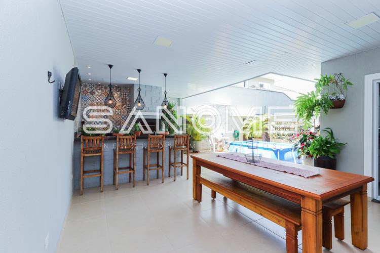 4 dormitórios (2 suítes – suíte máster com closet, sacada e banheira), Banheiro social, Sala 2 ambientes, Sala de TV, Lavabo, Cozinha com despensa, Área de serviço, Banheiro externo, Área gourmet e Quintal com ducha.