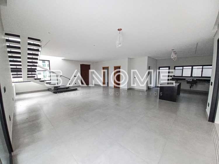 Piso térreo: Salas integradas, Lavabo, Sala de TV, Cozinha integrada, Despensa, Área de serviço, Área gourmet, Banheiro de lazer externo, Depósito/Hobby box e Piscina.