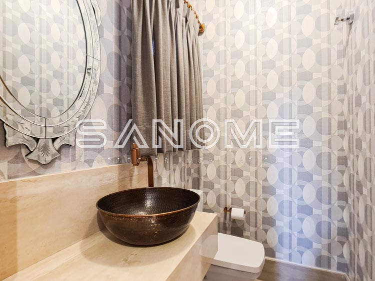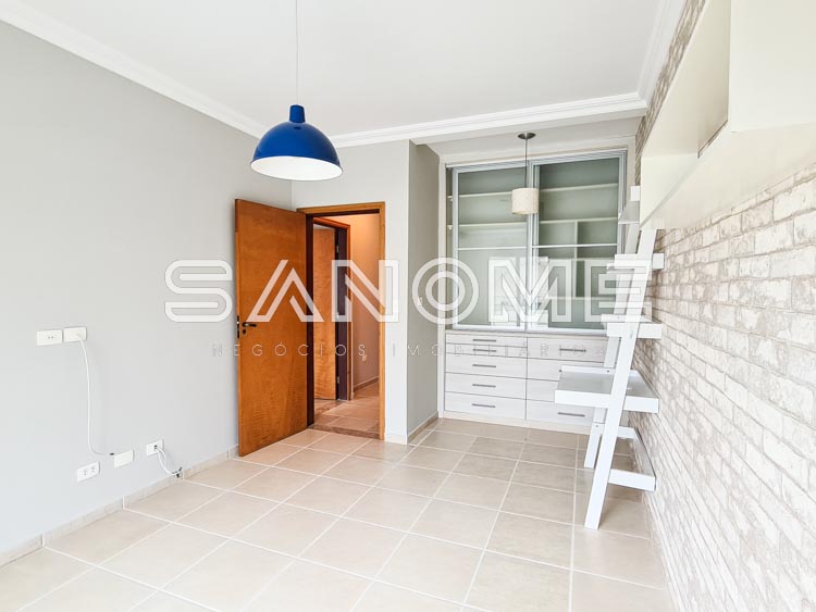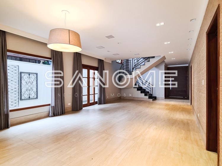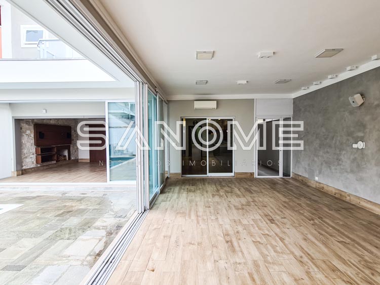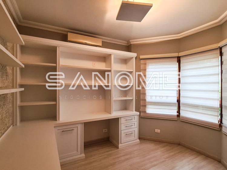 4 dormitórios (3 suítes – suíte máster com closet e hidromassagem), Roupeiro no corredor entre os quartos, Home Theater no piso superior (com ar condicionado), Sala 2 ambientes (com sonorização e iluminação indireta), Lavabo, Escritório mobiliado (com ar condicionado), Sala de lareira integrada com área externa (com ar condicionado), Cozinha completa integrada ao espaço gourmet (com cooktop, coifa, microondas e forno elétrico Elettromec), Despensa, Área de serviço com quarto e banheiro de empregados, Espaço gourmet completo com ar condicionado, fechamento em vidro e sonorização (coifa, cooktop e churrasqueira a gás Elettromec – adega e frigobar), Banheiro externo, Piscina com iluminação e Spa aquecido.