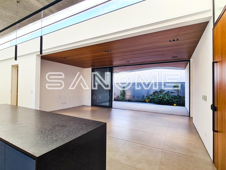 Térrea, 3 suítes com piso vinílico, closet e jardim privativo (suíte máster com banheira), Lavabo com jardim privativo, Salas integradas, Cozinha (com cooktop 5 bocas e coifa Brastemp Gourmand – ilha redonda Quartzo Suggar), Despensa, Área de serviço e Área gourmet.