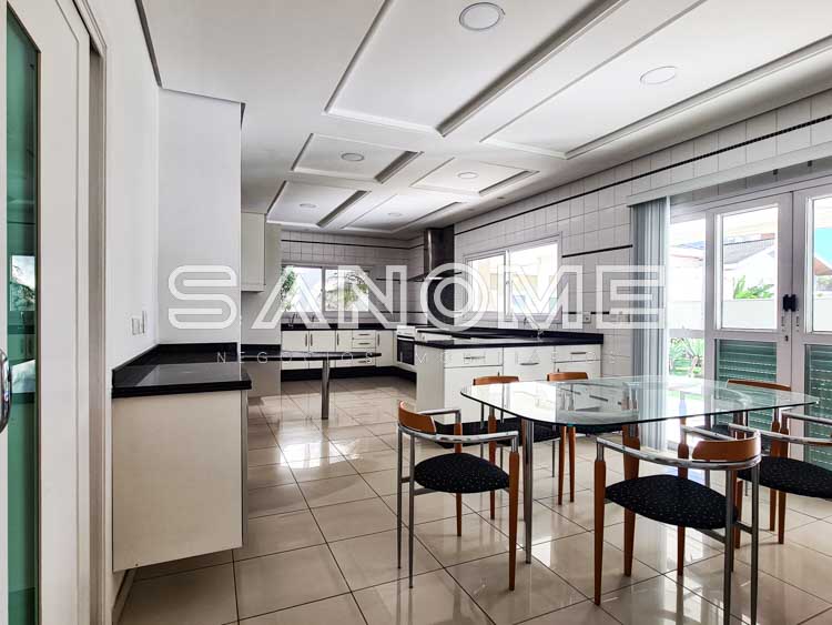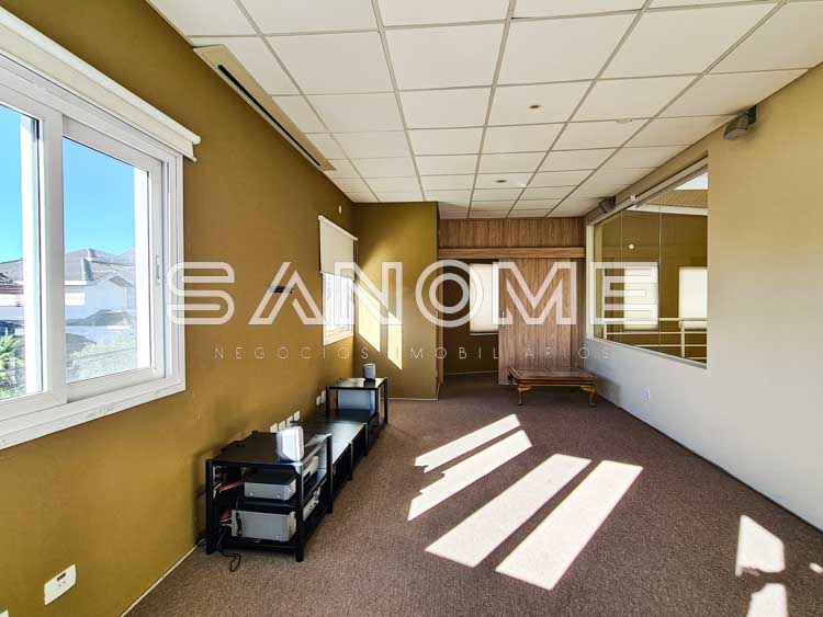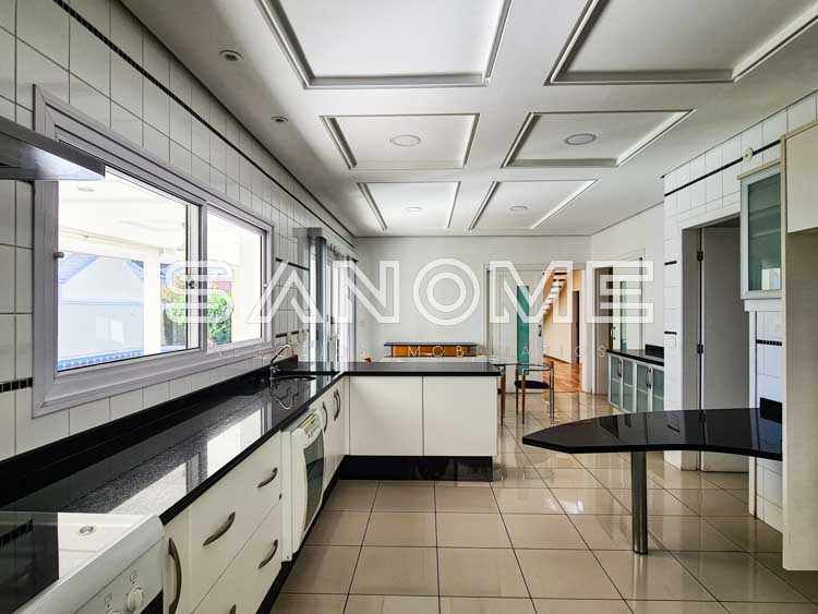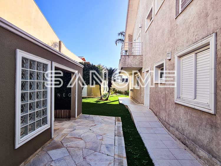 Piso térreo: Hall de entrada, Escritório/1 Suíte, Sala 2 ambientes com pé direito duplo, Sala de jantar, Lavabo, Sala de TV privativa (com acesso ao piso superior), Ampla cozinha planejada com copa e acesso para área de lazer, Despensa, Área de serviço, Lavanderia, Quarto e banheiro de empregados, Área gourmet completa, Piscina e Amplo quintal gramado com paisagismo, canil e salão multiuso com banheiro.