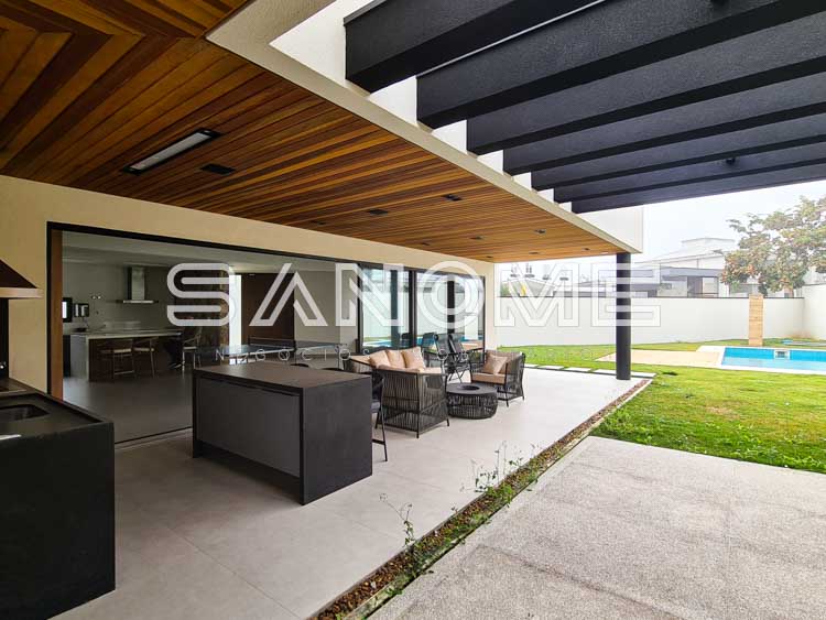 Térrea, 4 suítes (suíte máster com closet), Salas integradas, Pé direito duplo, Lavabo, Cozinha integrada, Despensa, Área de serviço, Área gourmet com churrasqueira, Banheiro externo, Amplo quintal gramado e Piscina preparada para aquecimento.