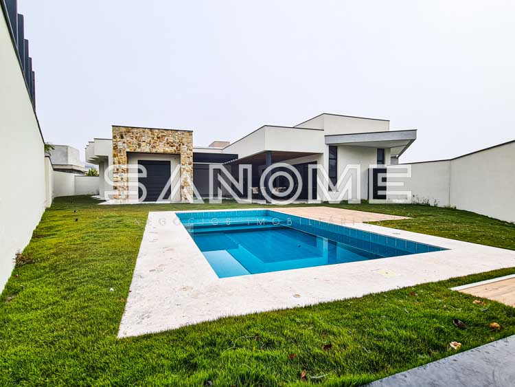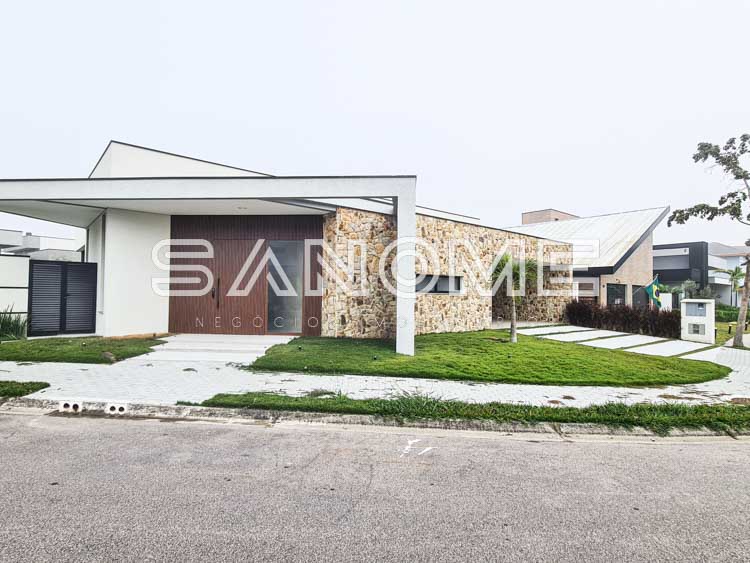 Térrea, 4 suítes (suíte máster com closet), Salas integradas, Pé direito duplo, Lavabo, Cozinha integrada, Despensa, Área de serviço, Área gourmet com churrasqueira, Banheiro externo, Amplo quintal gramado e Piscina preparada para aquecimento.