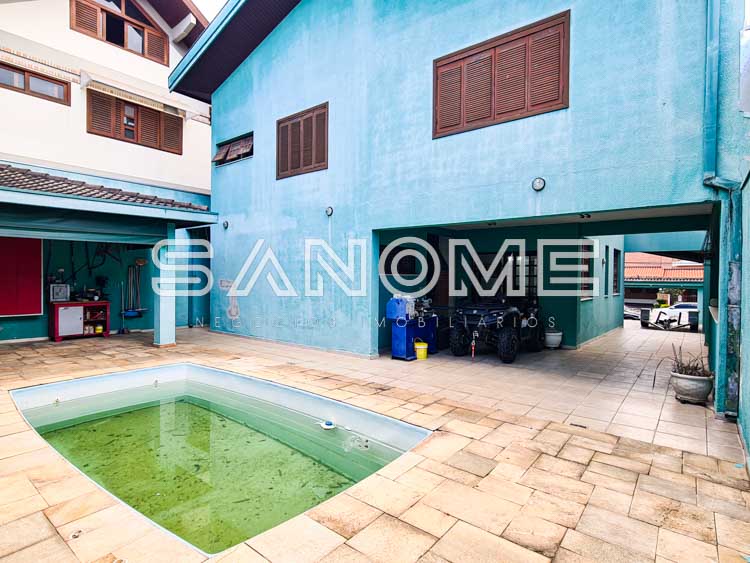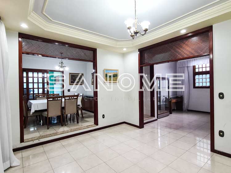 Piso térreo: Sala de estar, Lavabo, Sala de TV, Saleta com espaço para adega, Sala de almoço, Cozinha planejada, Área de serviço, Despensa, Banheiro de empregados, Quartinho multiuso, Quintal com piscina e Área de churrasqueira.