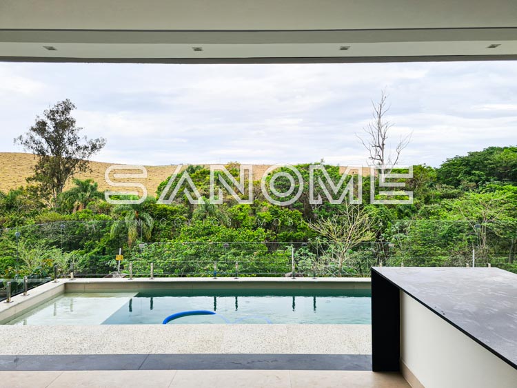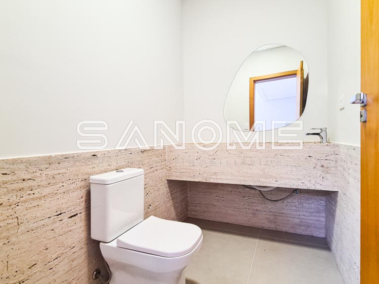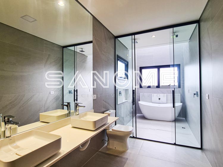 Escada em travertino romano bruto, Pedras atérmicas ao redor da piscina, Sistema de recirculação de água quente, Jardim com sistema de tubo dreno, Janelas das suítes com persianas automatizadas (com tela mosquiteiro e blackout), Luz de emergência e Ponto de gás para lareira na bancada da TV.