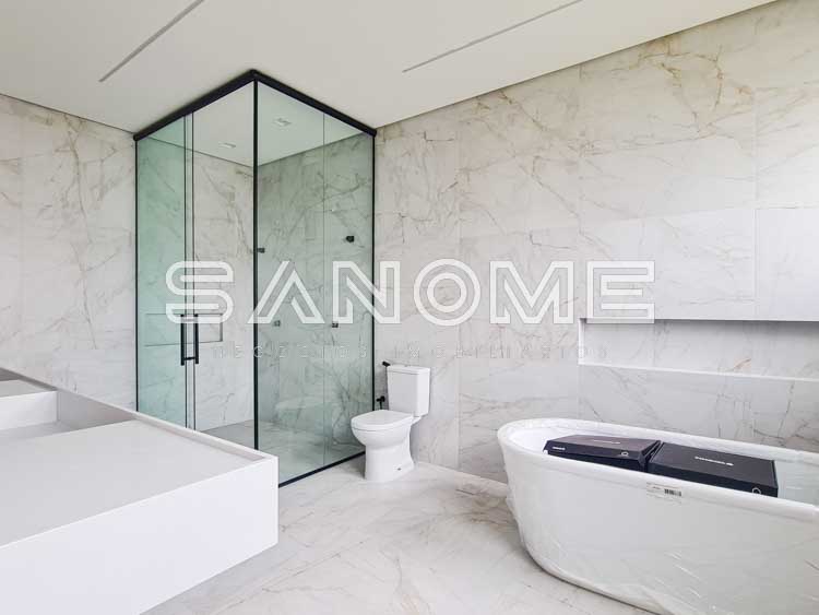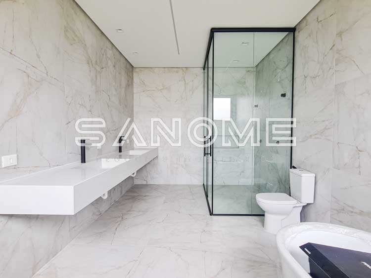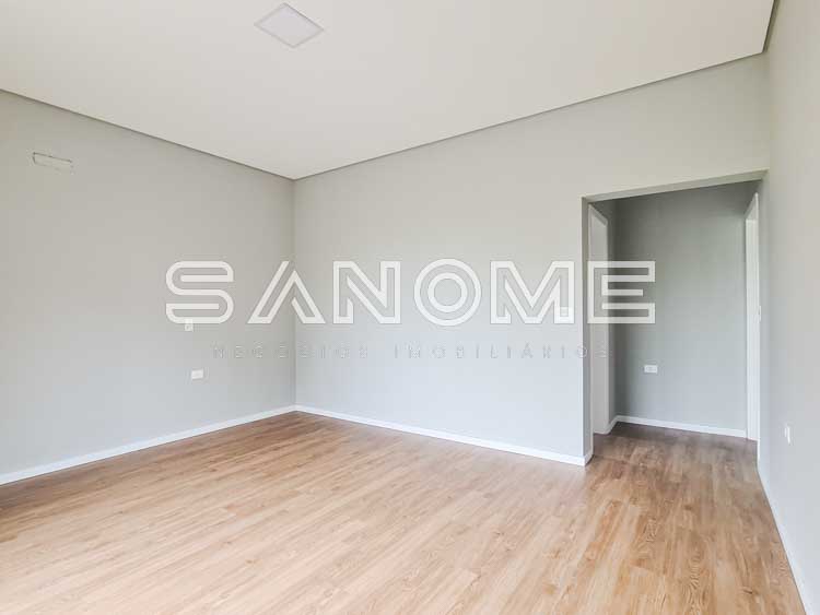 Piso inferior: 1 suíte multiuso, Salas integradas, Lavabo, Cozinha integrada, Área de serviço, Despensa, Depósito hobby box, Área gourmet, Banheiro de lazer externo e Piscina.