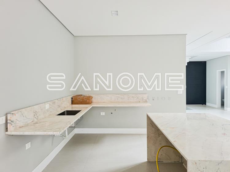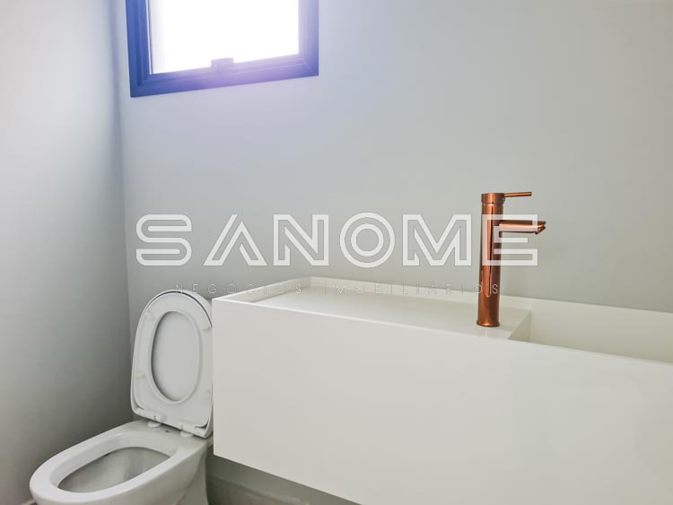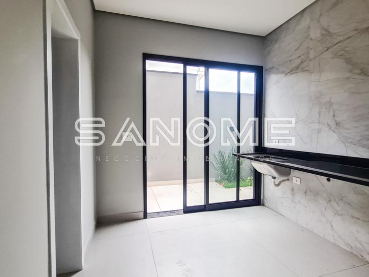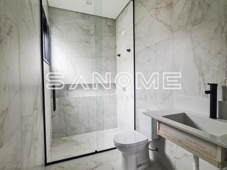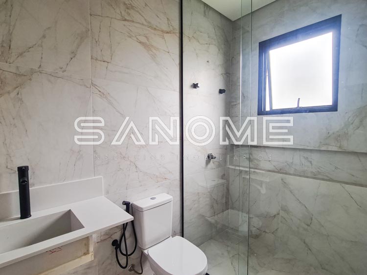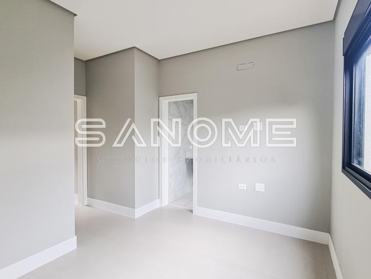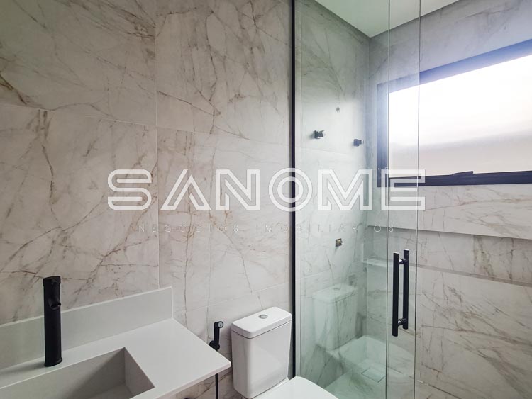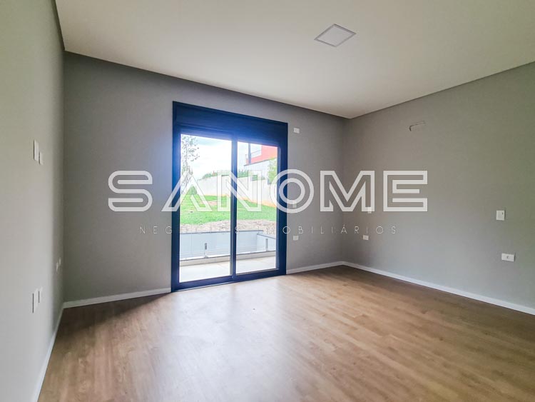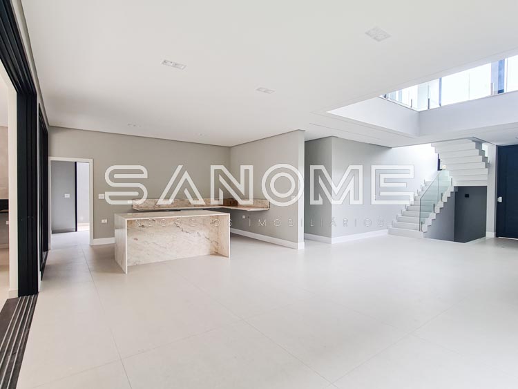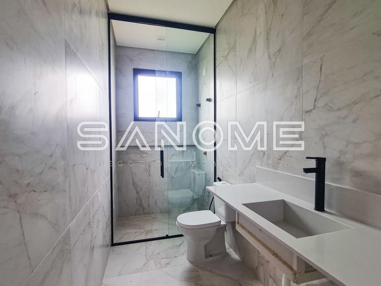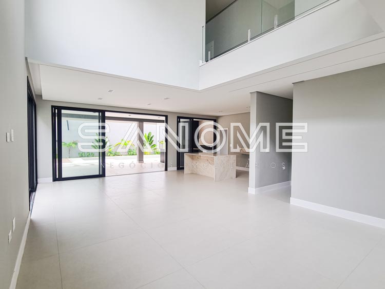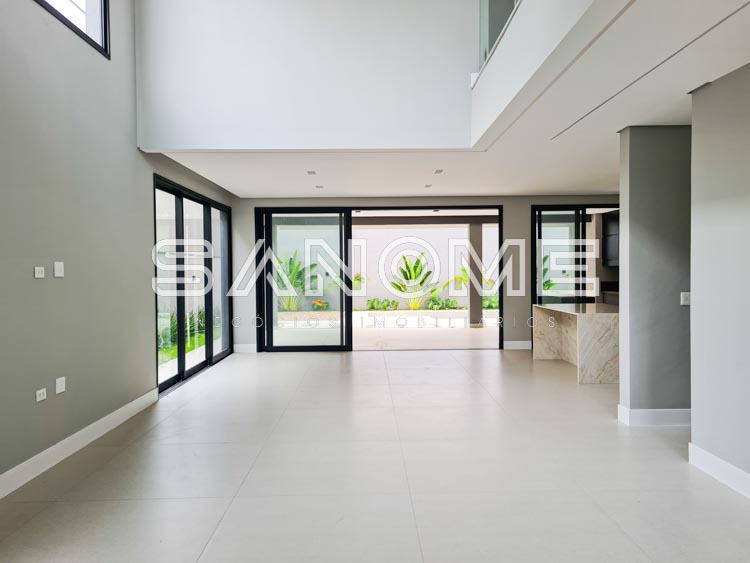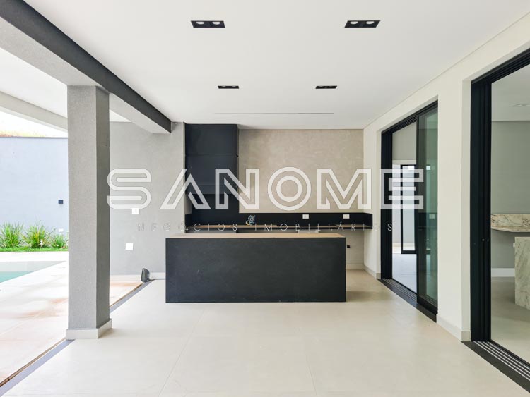 Piso inferior: 1 suíte multiuso, Salas integradas, Lavabo, Cozinha integrada, Área de serviço, Despensa, Depósito hobby box, Área gourmet, Banheiro de lazer externo e Piscina.