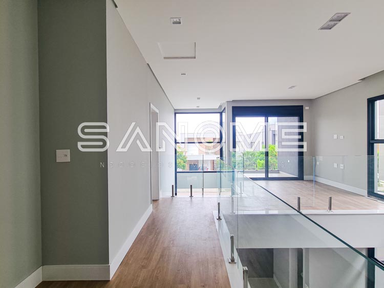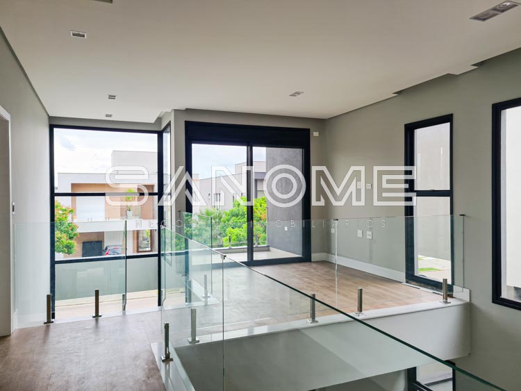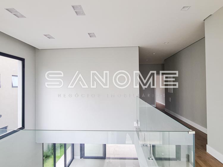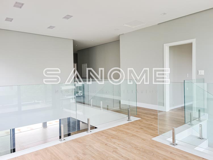 Piso superior: Sala íntima com varanda + 4 suítes.