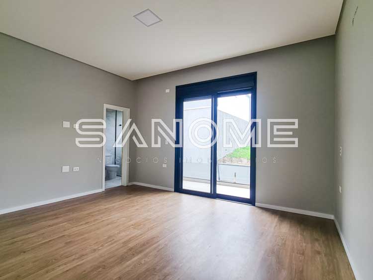 Piso inferior: 1 suíte multiuso, Salas integradas, Lavabo, Cozinha integrada, Área de serviço, Despensa, Depósito hobby box, Área gourmet, Banheiro de lazer externo e Piscina.