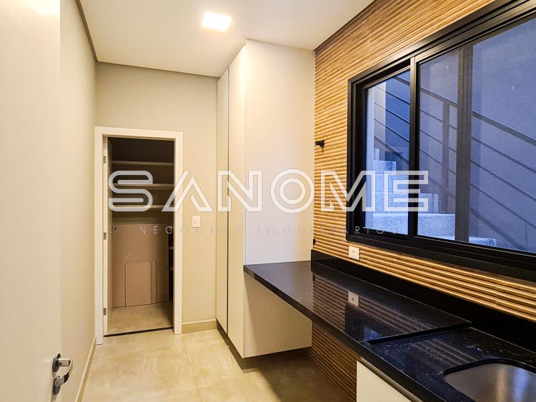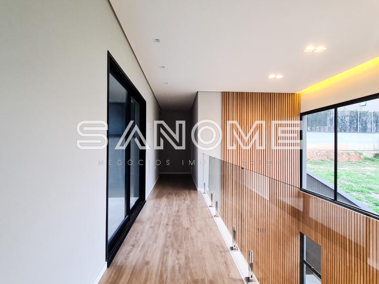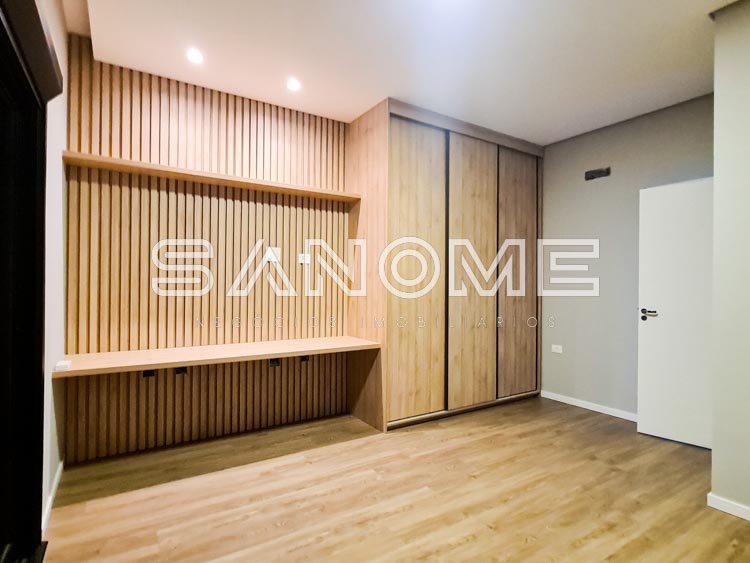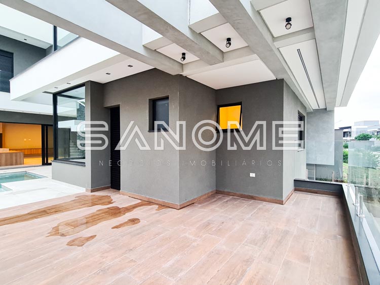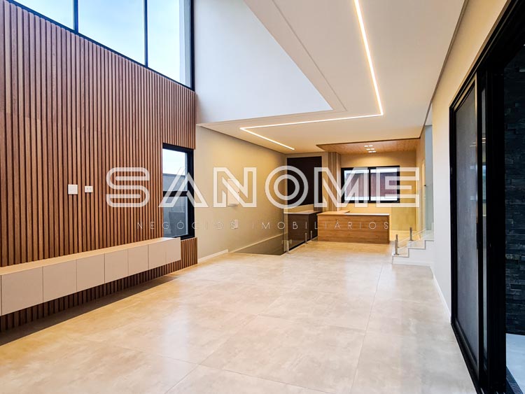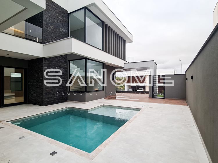 Piso principal: Salas integradas, Escritório com banheiro (reversível +1 suíte), Lavabo, Cozinha gourmet integrada, Área de serviço, Despensa, Banheiro de lazer externo, Varanda externa e Piscina com prainha.