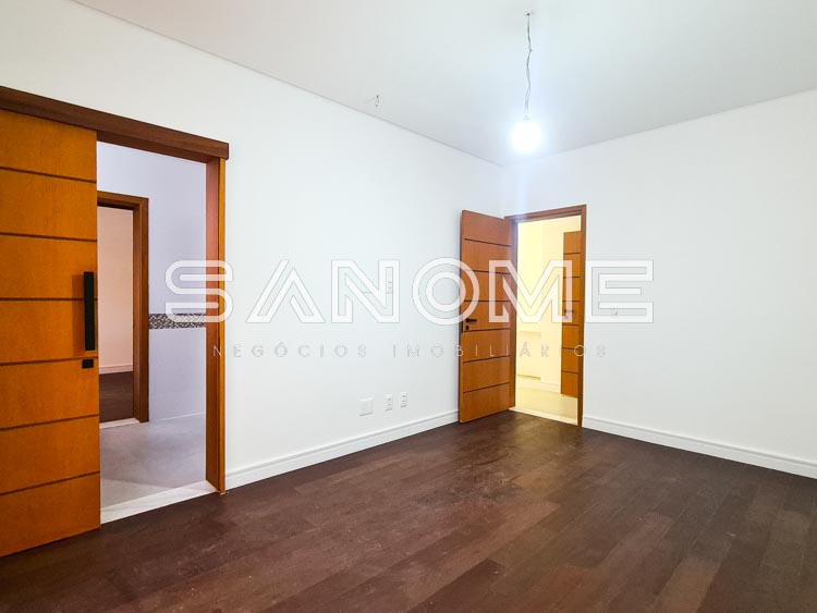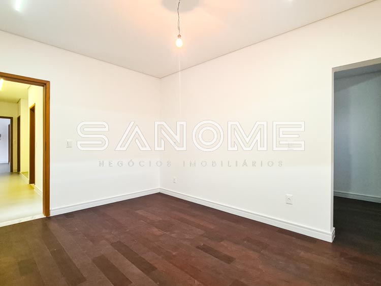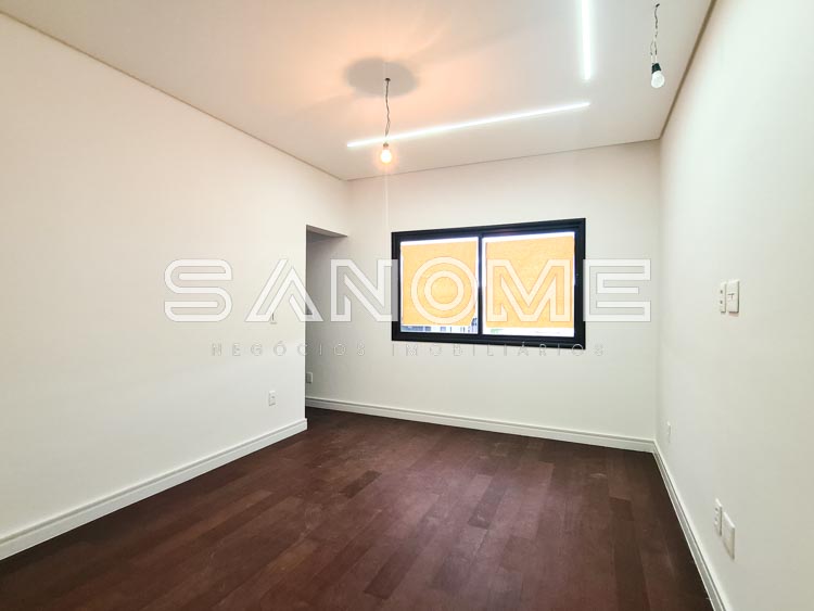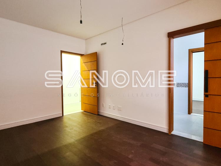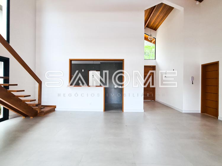 Piso principal: Salas integradas, Mezanino com varanda, Lavabo, Sala de TV, Cozinha integrada, Área de serviço, Banheiro de empregados, Varanda coberta com churrasqueira, Lareira e 3 suítes (2 americanas e 1 master com closet e pia dupla).