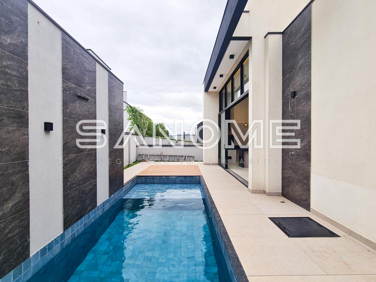 Térrea, Salas integradas, Pé direito alto, Escritório, Lavabo, Cozinha integrada, Área de serviço, Despensa, Área gourmet integrada, Banheiro de lazer externo e Piscina.