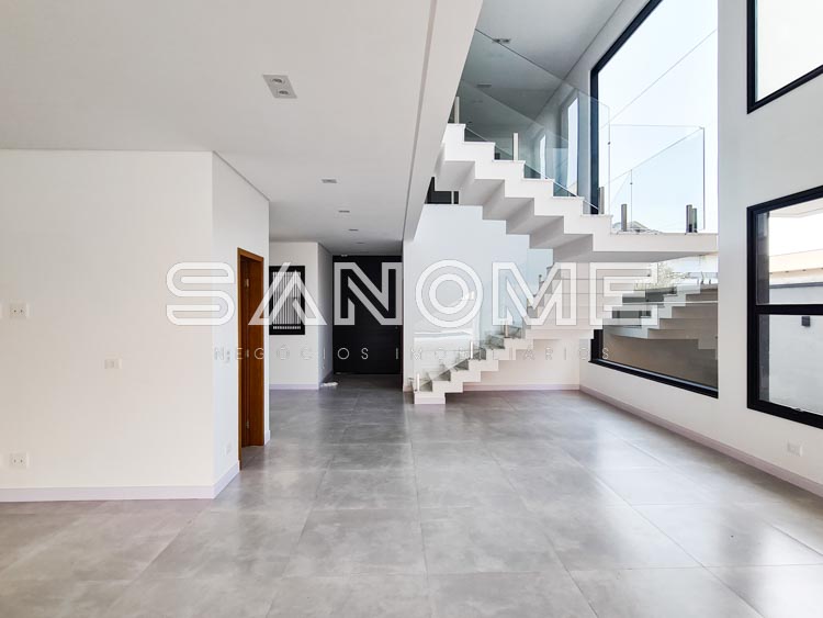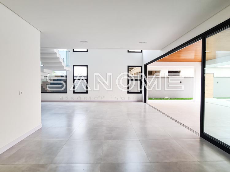 Piso térreo: Salas integradas, Lavabo, Escritório (1 suíte), Cozinha integrada, Área de serviço, Sala de TV, Área gourmet, Quintal gramado e Piscina.