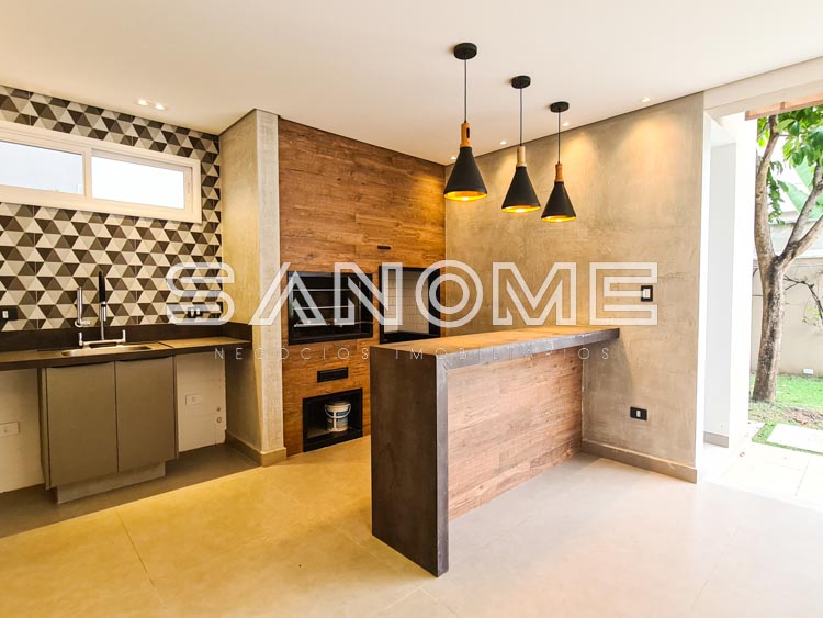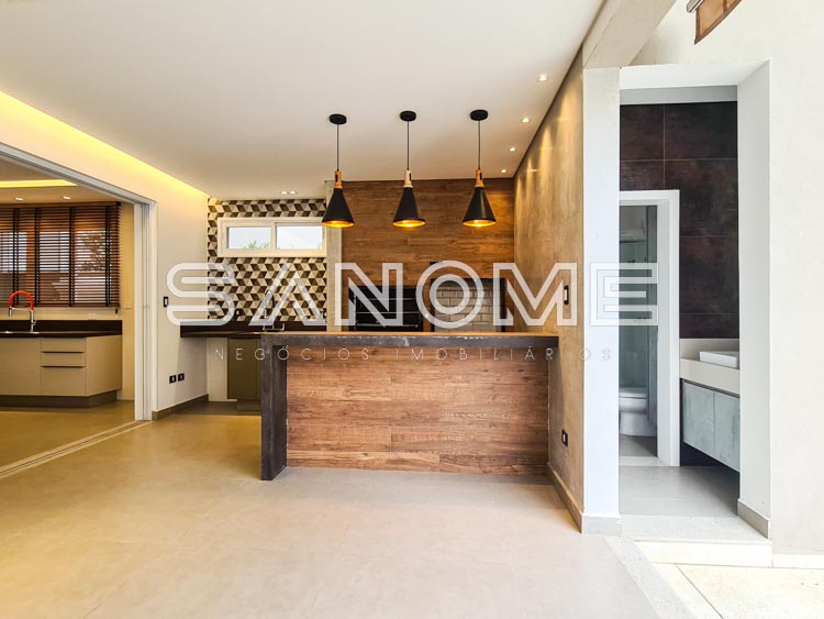 Piso térreo: Salas integradas com lareira e pé direito duplo, Sala de TV, Lavabo, Cozinha planejada com copa, Despensa, Área de serviço, Área gourmet, Banheiro de lazer externo, Quintal gramado e Piscina aquecida.