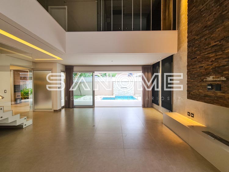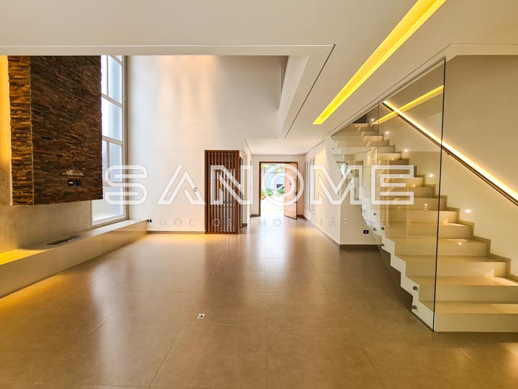 Piso térreo: Salas integradas com lareira e pé direito duplo, Sala de TV, Lavabo, Cozinha planejada com copa, Despensa, Área de serviço, Área gourmet, Banheiro de lazer externo, Quintal gramado e Piscina aquecida.