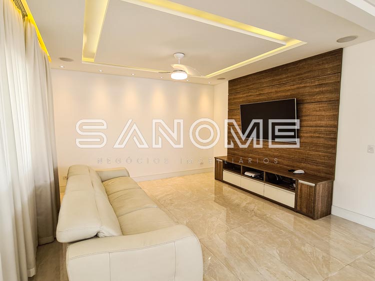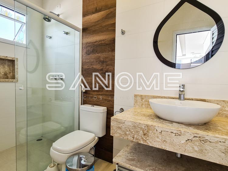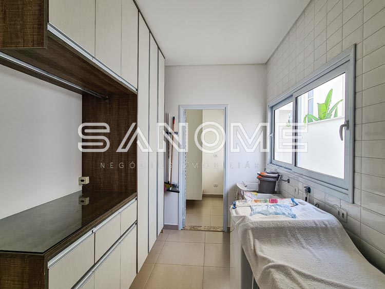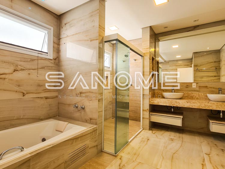 Piso térreo: 1 suíte completa com acesso a área externa, Sala de TV, Sala de jantar, Lavabo, Cozinha planejada, Área de serviço, Despensa, Quarto de depósito, Área gourmet completa, Banheiro de lazer externo e Piscina aquecida.