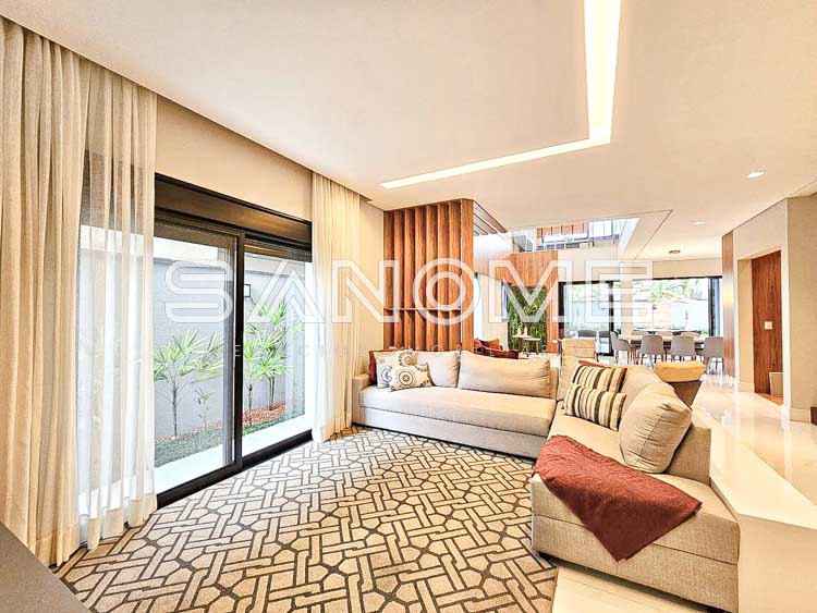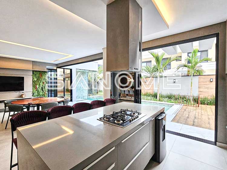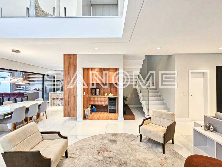 Piso térreo: Sala de TV com banheiro (reversível +1 suíte), Sala de estar, Lavabo, Sala de jantar, Cozinha integrada, Área de serviço, Área gourmet, Banheiro de lazer externo, Sauna e Piscina aquecida.