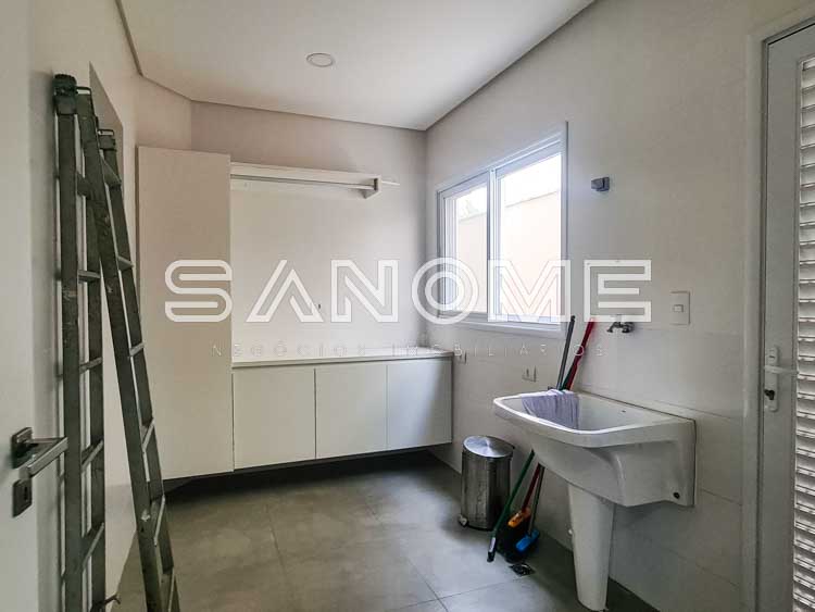 Piso térreo: Salas integradas com pé direito duplo, Lavabo, Escritório com banheiro, Cozinha com copa e despensa, Área de serviço, Área gourmet integrada, Banheiro de lazer externo e Amplo quintal gramado.