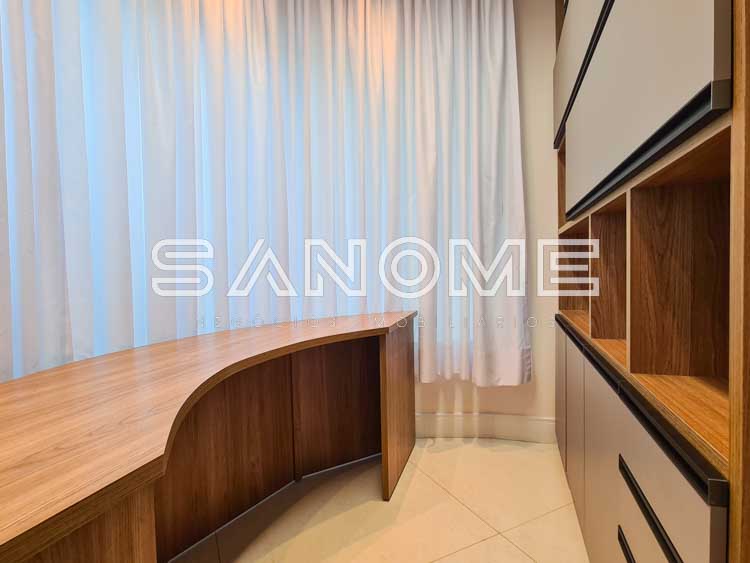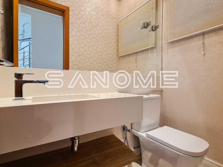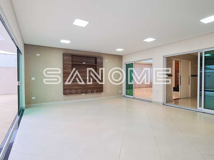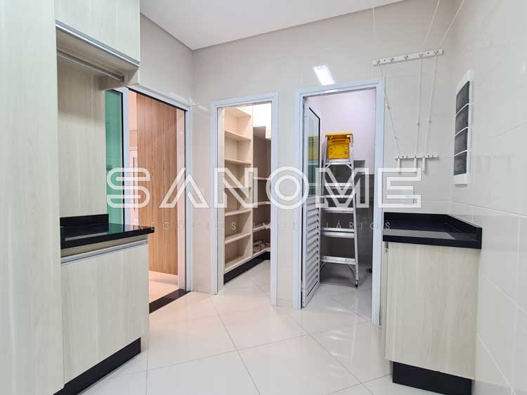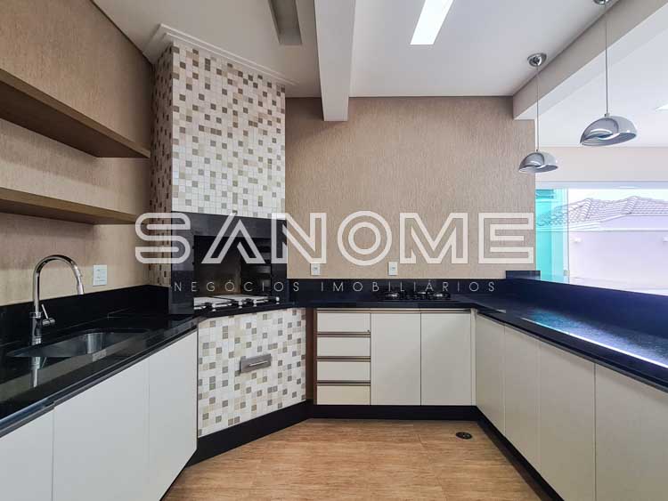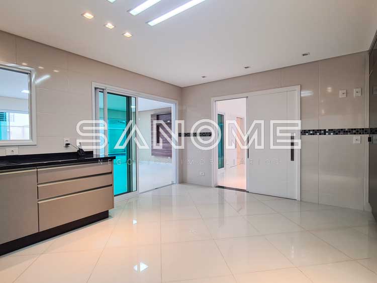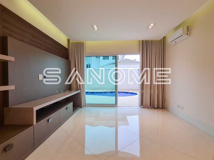 Piso térreo: Sala de estar, Sala de jantar, Escritório com ar condicionado, Lavabo, Sala de TV, Cozinha planejada (com armários Florense, cooktop, forno, microondas e pia com triturador elétrico), Área de serviço com despensa e depósito, Área gourmet com churrasqueira e cooktop a gás, Banheiro de lazer, Quarto de depósito com armários e Piscina com aquecimento solar.
