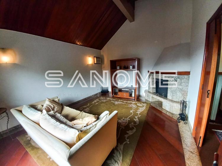 Piso intermediário: Sala de TV com lareira e varanda.