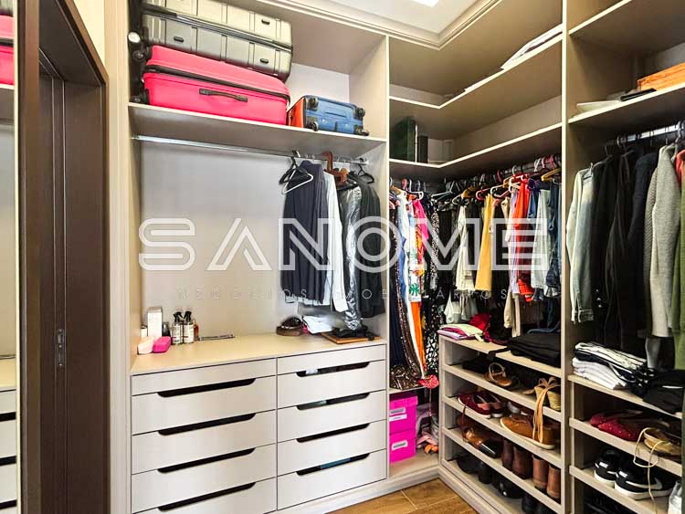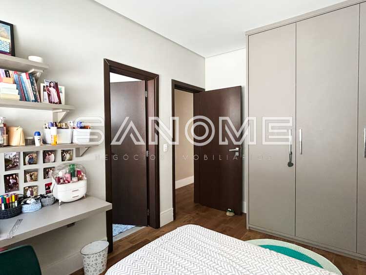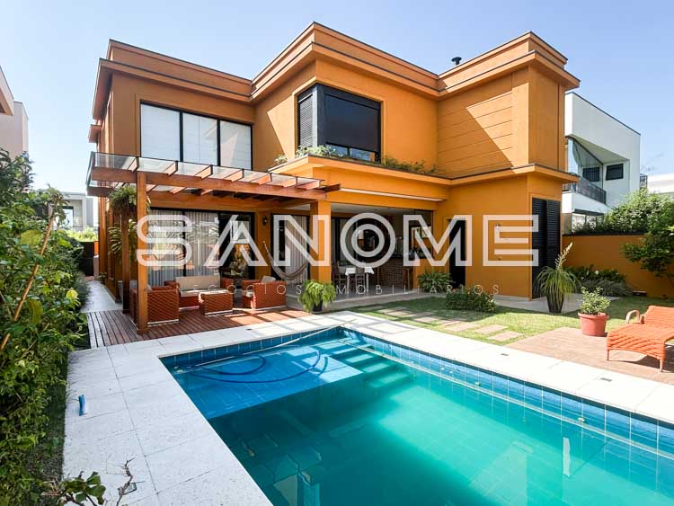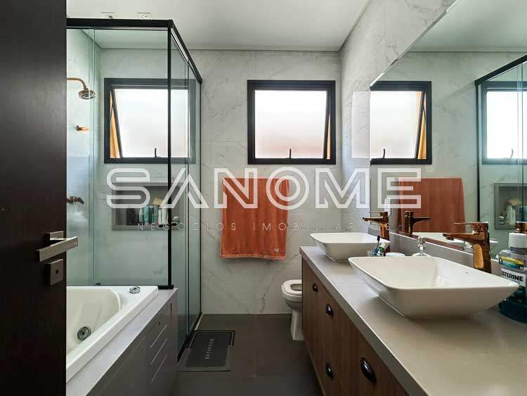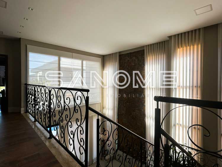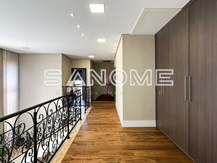 Piso superior: Hall com armários embutidos, Sala de TV + 4 suítes (master com closet e hidromassagem).