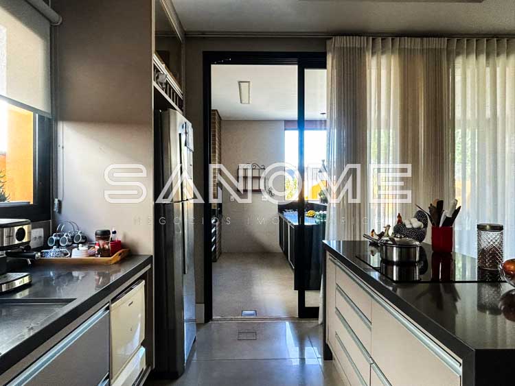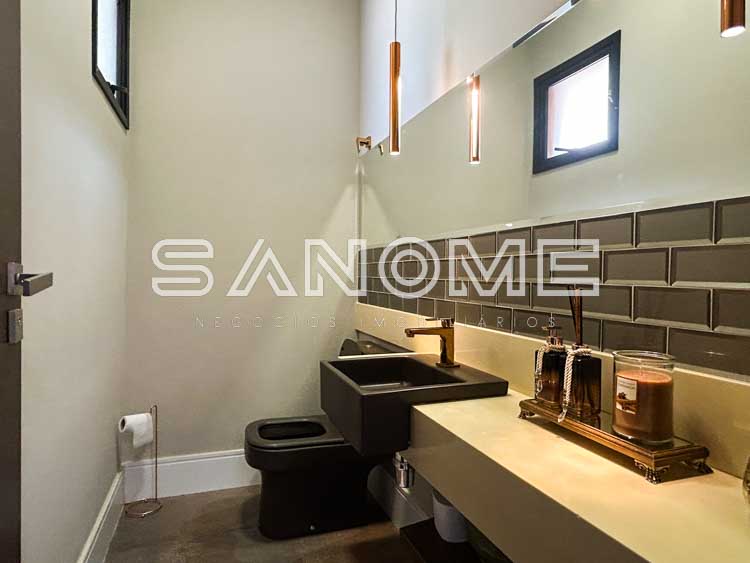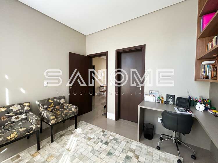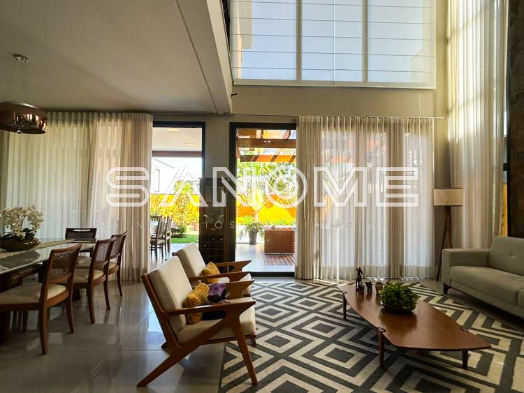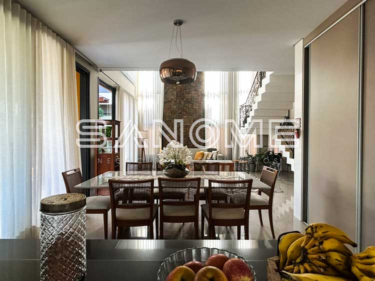 Piso térreo: Hall de entrada, Escritório/Suíte, Lavabo, Sala de estar com pé direito duplo, Sala de jantar, Cozinha integrada completa, Área de serviço, Varanda externa, Área gourmet completa, Banheiro de lazer externo e Piscina.