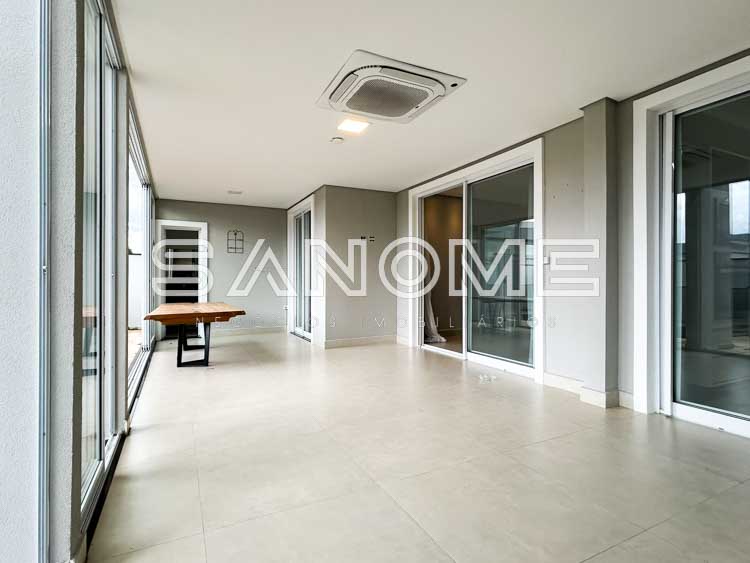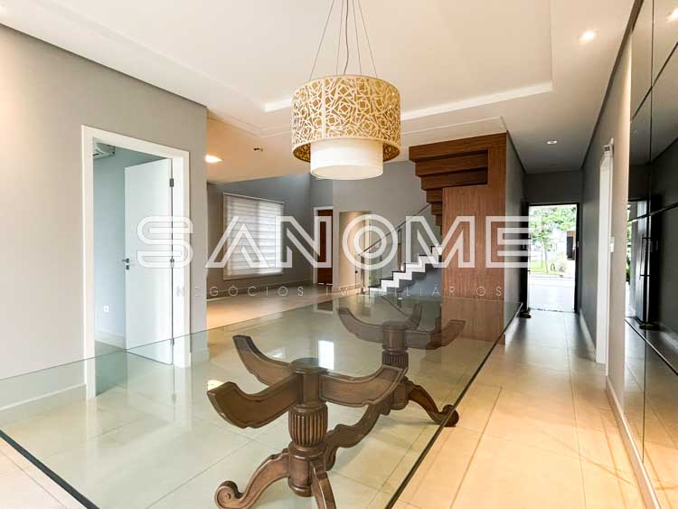 Piso térreo: Sala de estar com pé direito duplo, Sala de jantar, Escritório (reversível +1 suíte), Lavabo, Sala de TV privativa, Cozinha planejada com despensa, Área de serviço, Varanda gourmet com fechamento em vidro, Banheiro de lazer externo e Piscina.