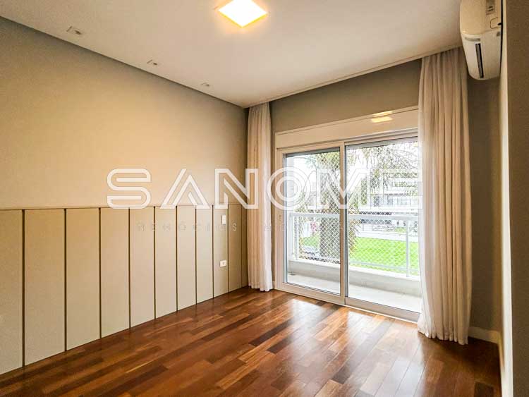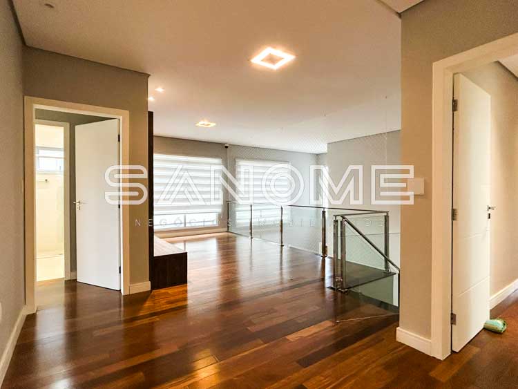 Piso superior: Sala de TV entre os quartos + 4 suítes (master com amplo closet, varanda externa e sala de banho).